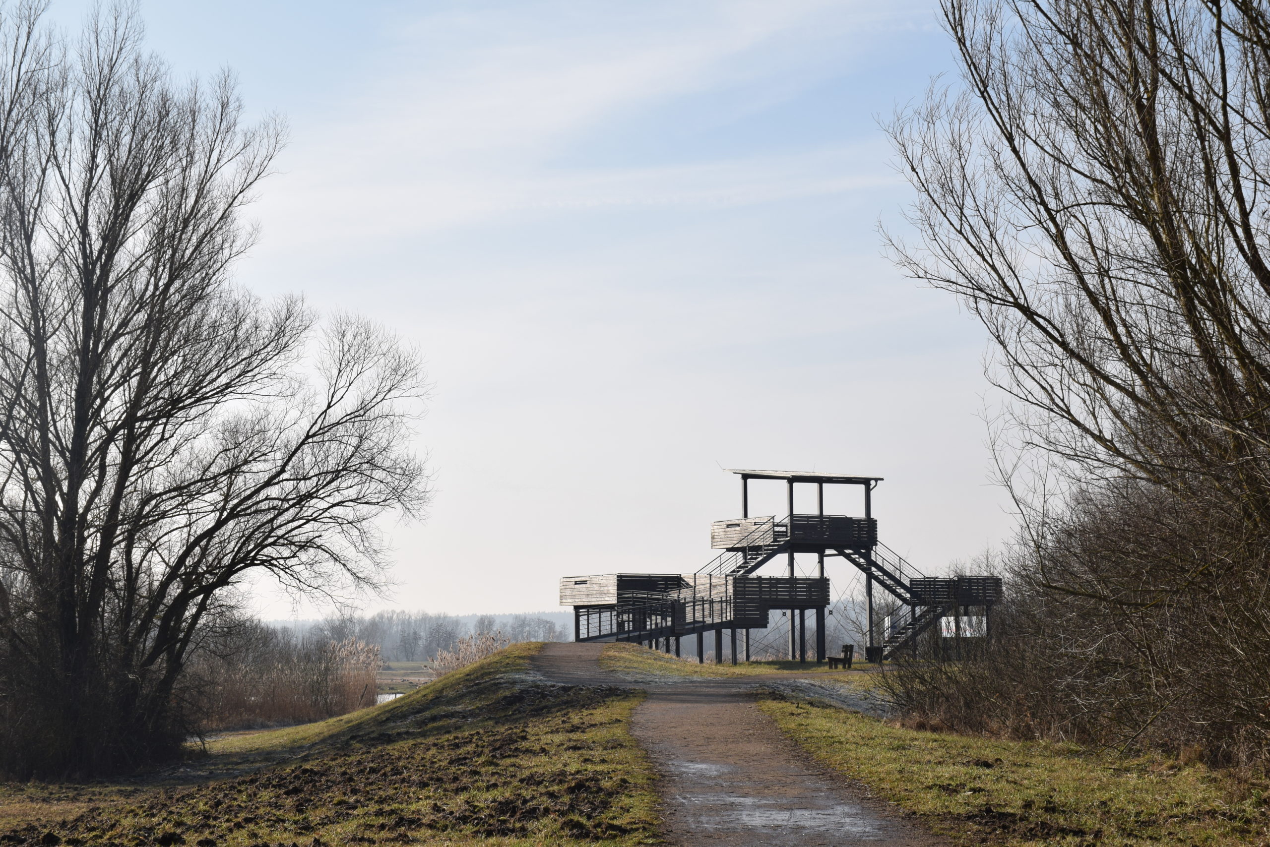 Über eine lange Brücke geht es auf die Vogelinsel, eines der wertvollsten Naturschutzgebiete Bayerns. Auf den Holzplanken liegt eine dünne Frostschicht. (Achtung, es könnte glatt sein!) Es knarrt ein wenig, als wir darüber gehen. Am Ende der Brücke eröffnet sich eine andere Welt. Knorrig und ohne Blätter stehen die Bäume da. Die Sonne blinzelt durch die kahlen Äste. Auf einem Pfad geht es rund um die Vogelinsel. Der ist breit genug, um dort mit Rollstuhl oder Kinderwagen zu fahren. Durch den gefrorenen Boden bekommen wir auch keine matschigen Reifen.