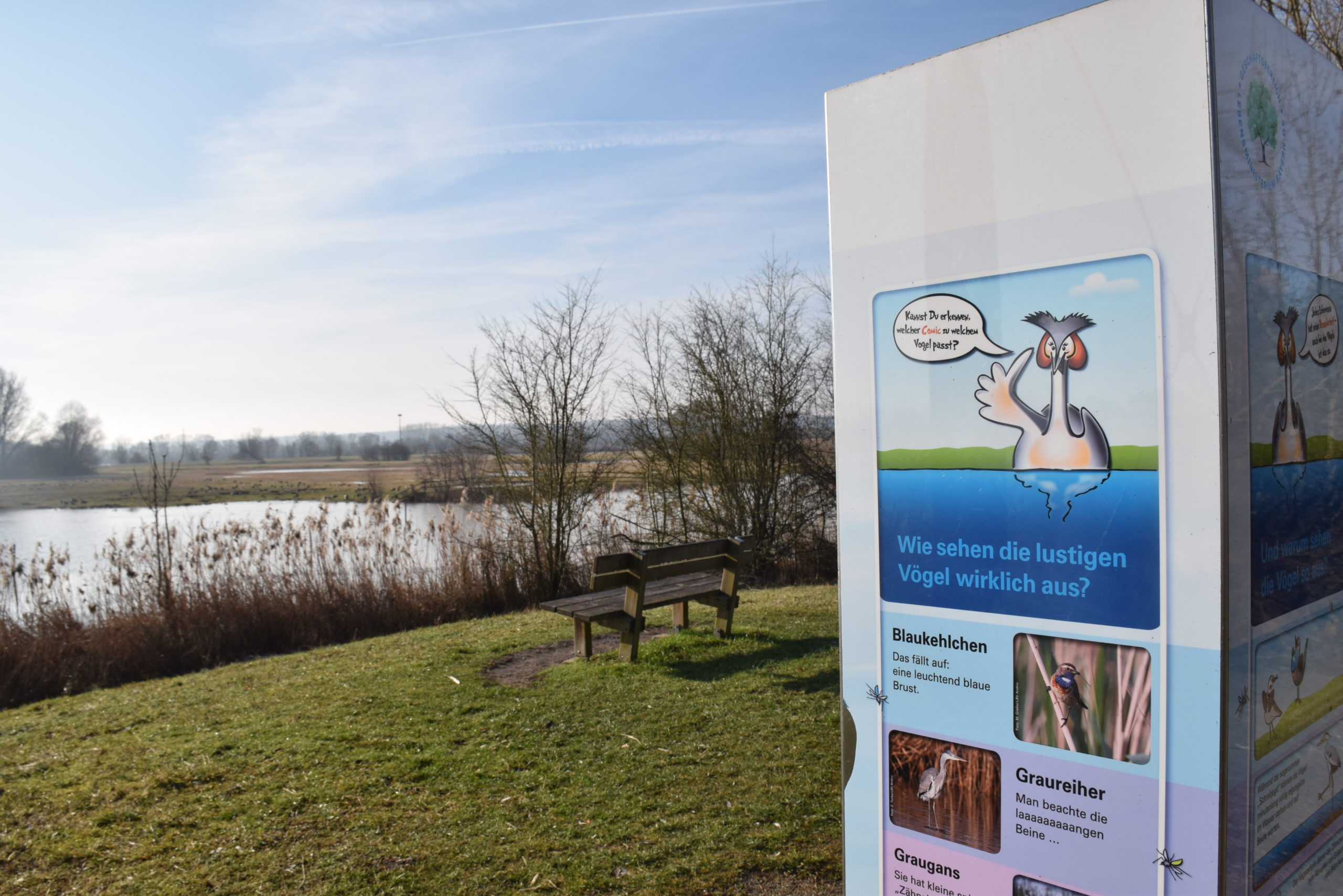 Überhaupt gibt es für Kinder neben den Vögeln einiges zu entdecken: Auf Schautafeln können sie erfahren, welche Vögel auf der Vogelinsel leben, wann sie brüten und wer sonst noch hier lebt. Denn im Winter kann man vor allem in der Dämmerung Biber beobachten, berichtet Martina Widuch vom LBV. „Der Biber hält auch keinen Winterschlaf und schwimmt regelmäßig sein Revier ab und sorgt dabei auch dafür, dass seine Wege und einige Löcher im Eis offen bleiben“, erklärt Widuch weiter.