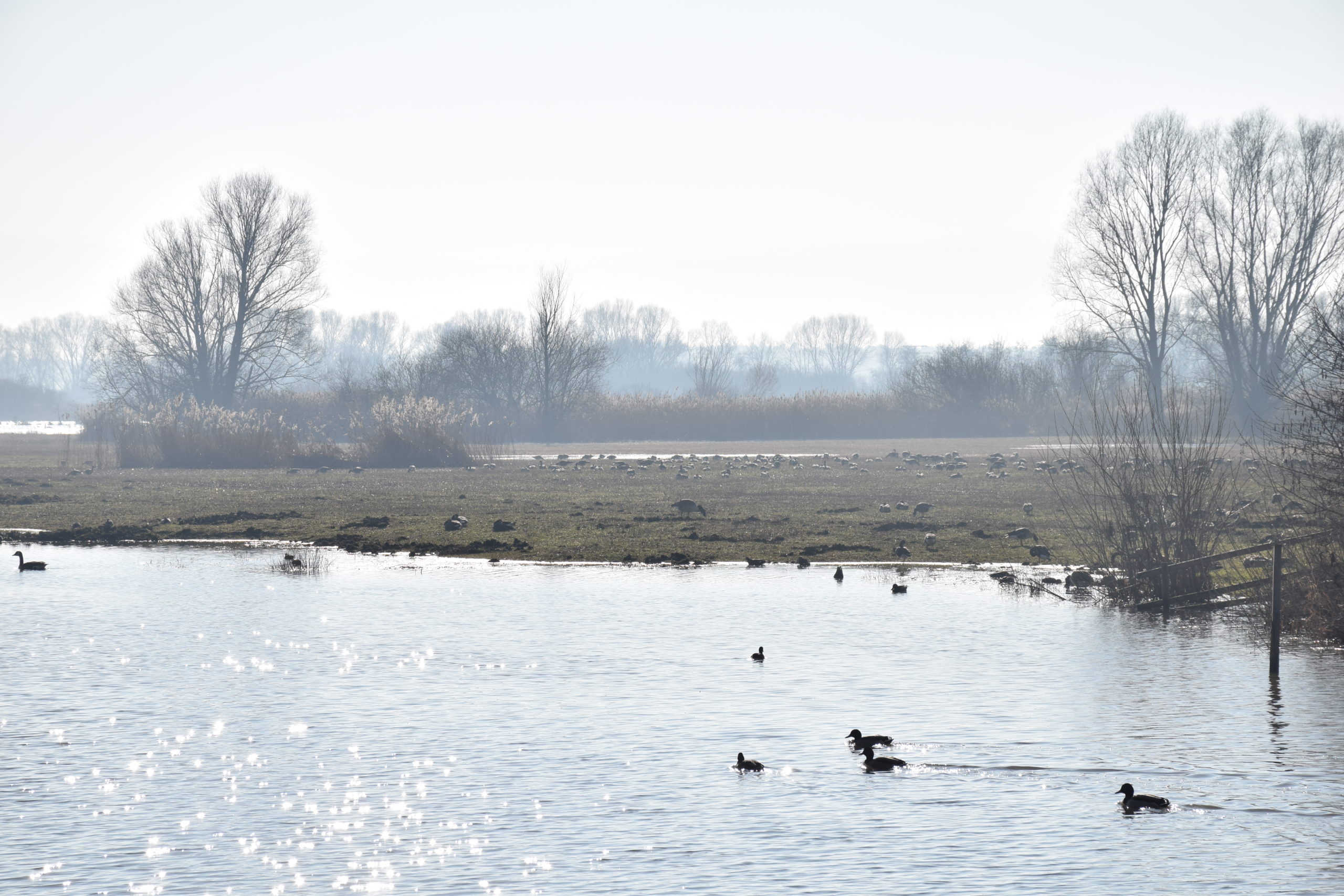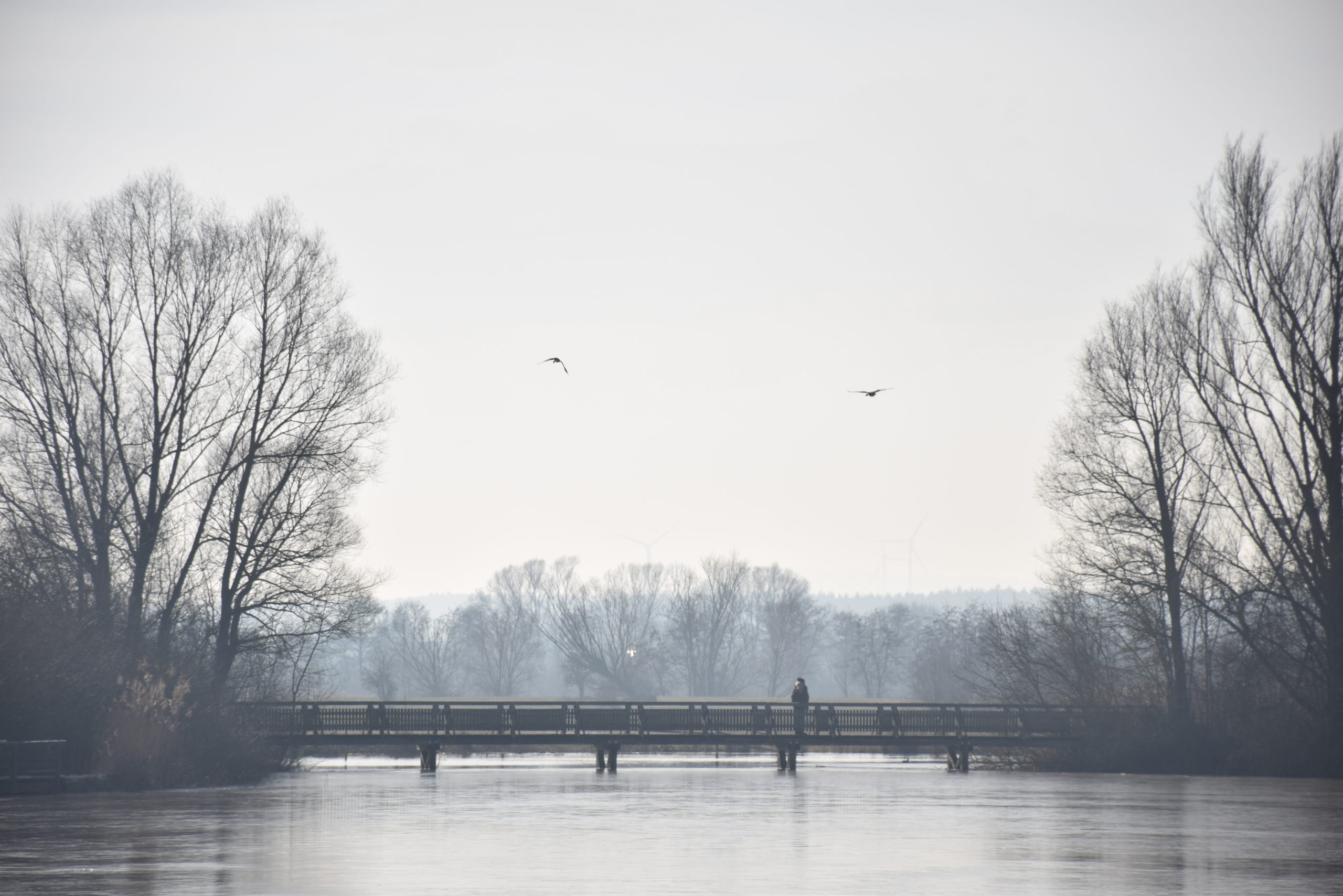 Nach zirka einer Stunde verlassen wir den rund eineinhalb Kilometer langen Rundweg und sind fast ein bisschen traurig, dass wir über die lange Brücke wieder im hier und jetzt landen. Ein Schwarm Wildgänse fliegt über uns hinweg, landet geräuschvoll auf dem Wasser und bietet uns ein schönes Bild zum Abschied.