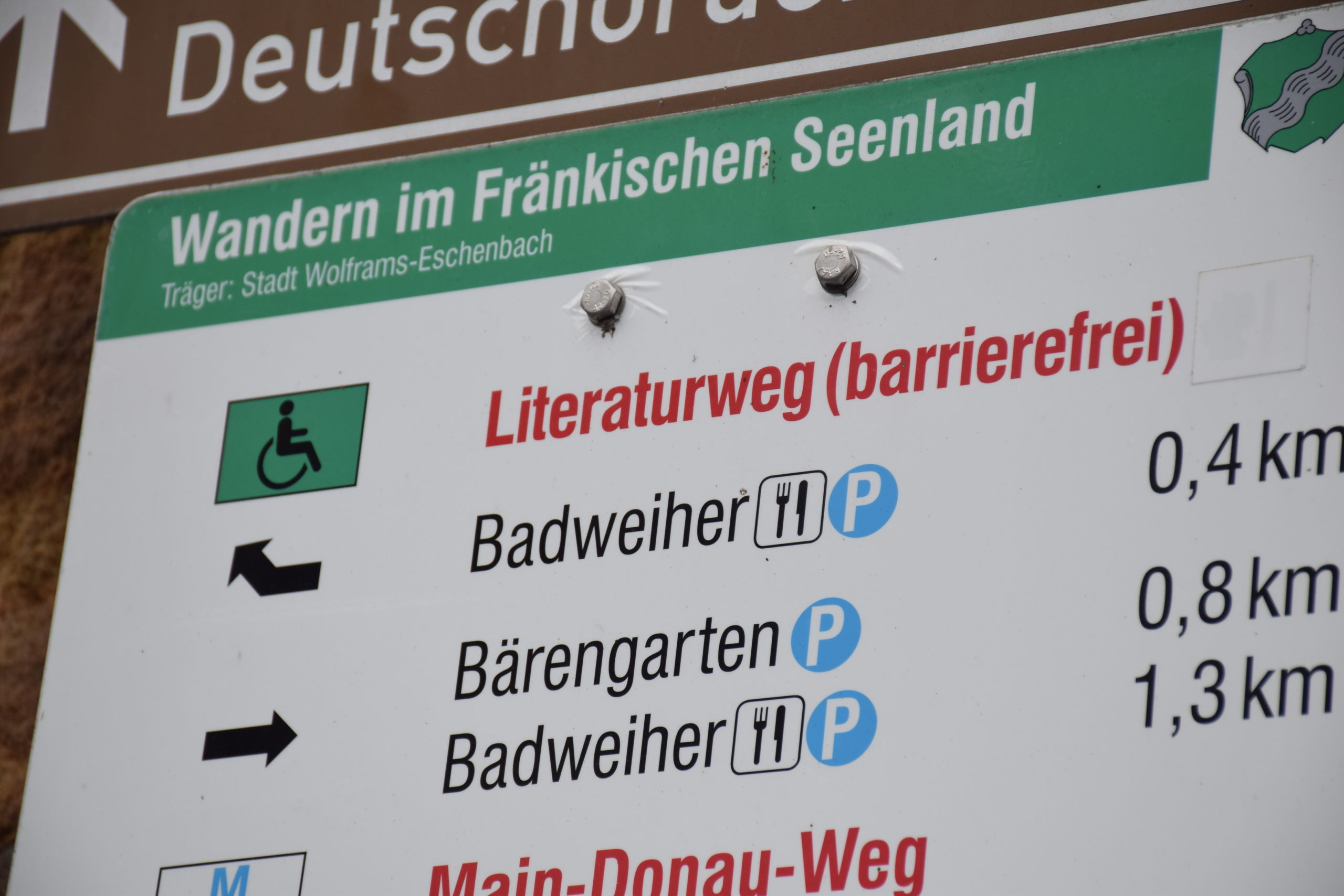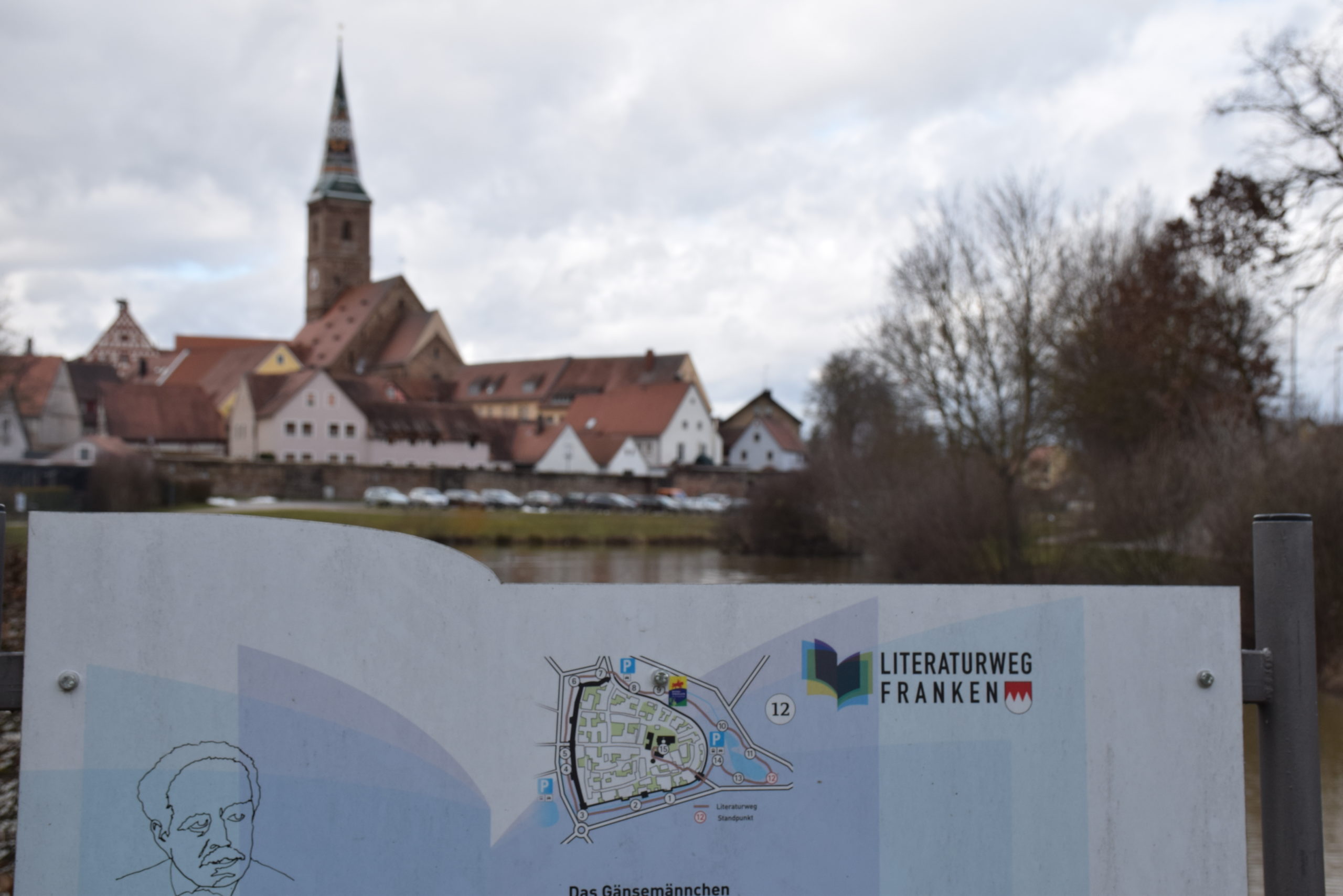 Der Literaturweg Franken ist mit seinen 2,2 Kilometern Länge ein gutes Ziel für einen entspannten Ausflug. Der Parkplatz am Unteren Tor ist ein super Ausgangspunkt für den Rundweg. Auf dem barrierefreien Pfad geht es in den Stadtgraben in Richtung Kriegerdenkmal. Dort entdecken wir die erste Tafel. Sie ist Wolfram von Eschenbach, dem Namensgeber der Stadt gewidmet.