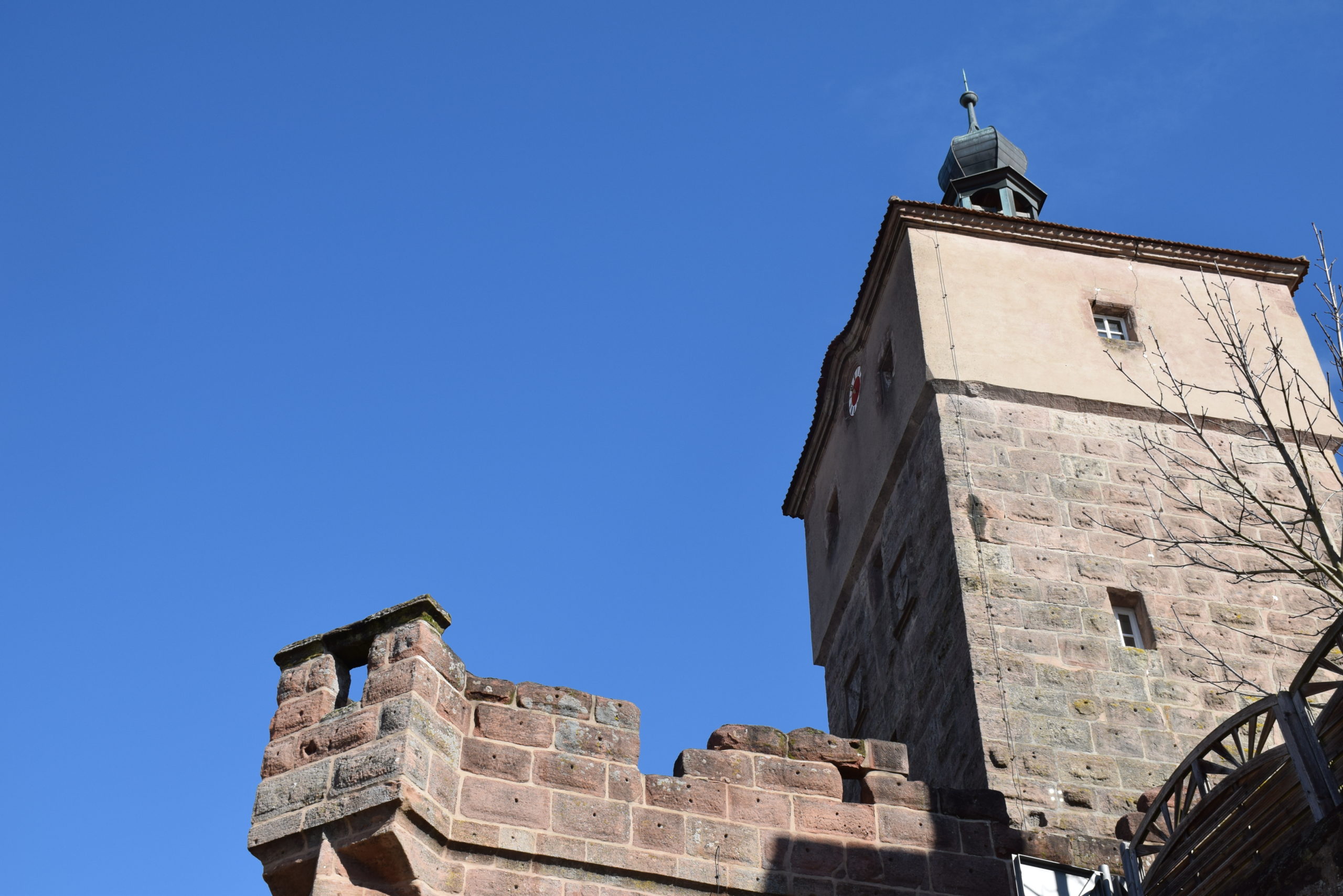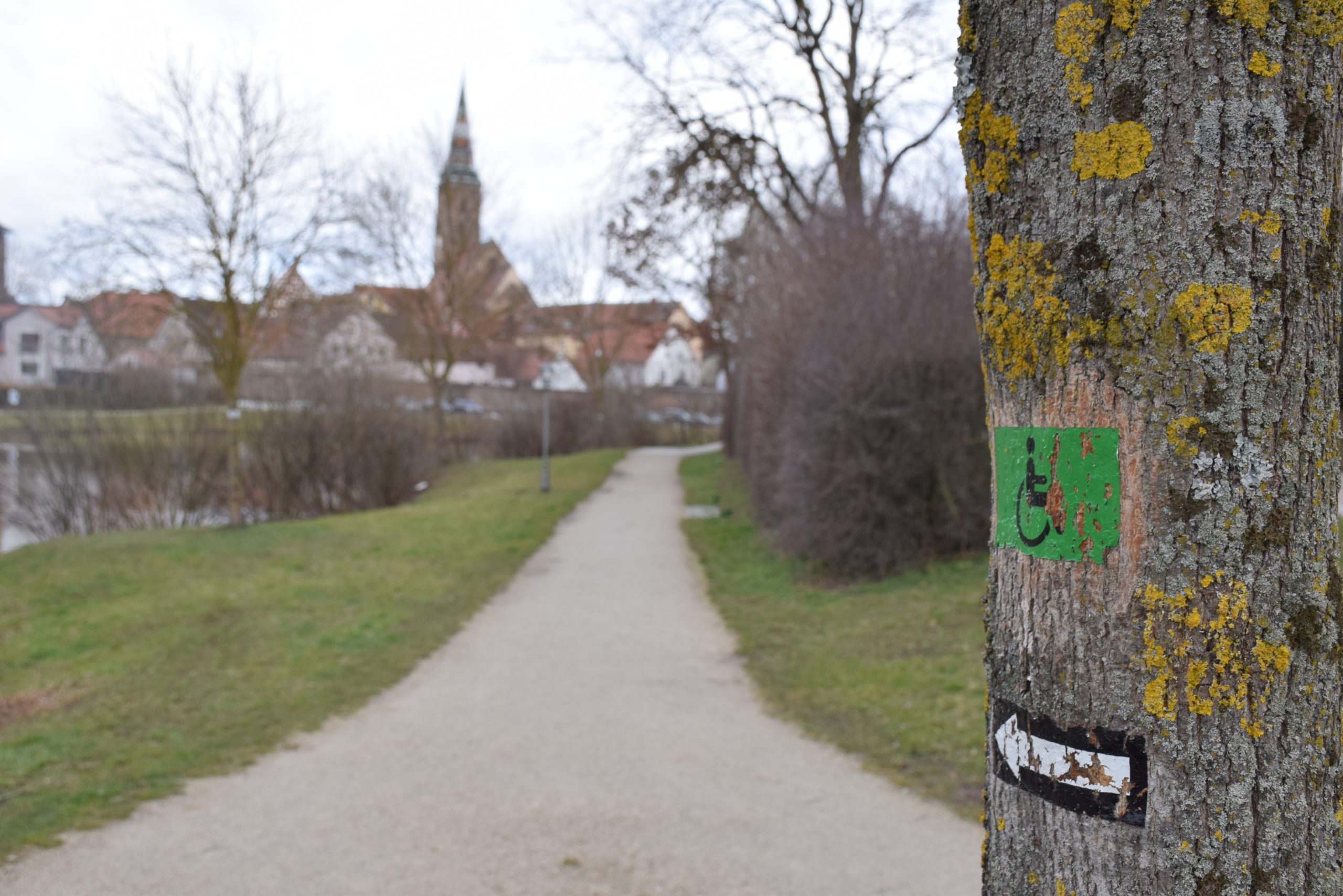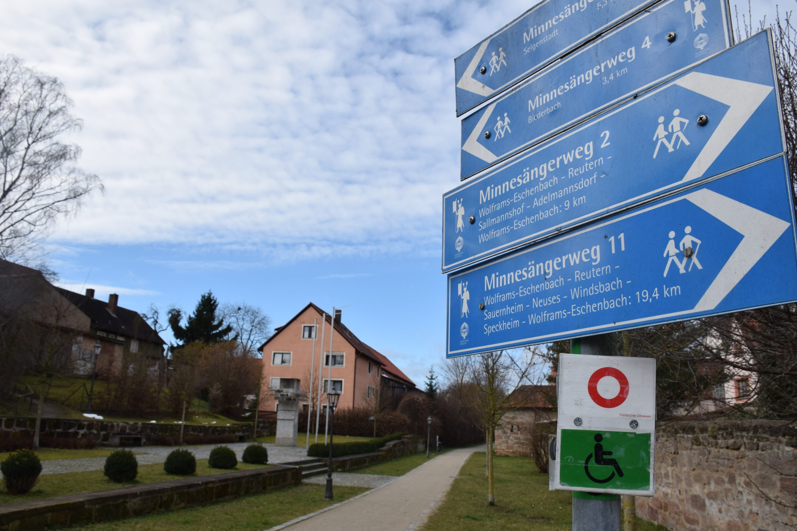 Die historische Stadtmauer, die im 14. Jahrhundert wappenförmig erbaut wurde als Eschenbach das Stadtrecht bekam, bietet eine perfekte Kulisse für den Literaturweg. Die hohe Stadtmauer ragt imposant in den kalten Märzhimmel.
