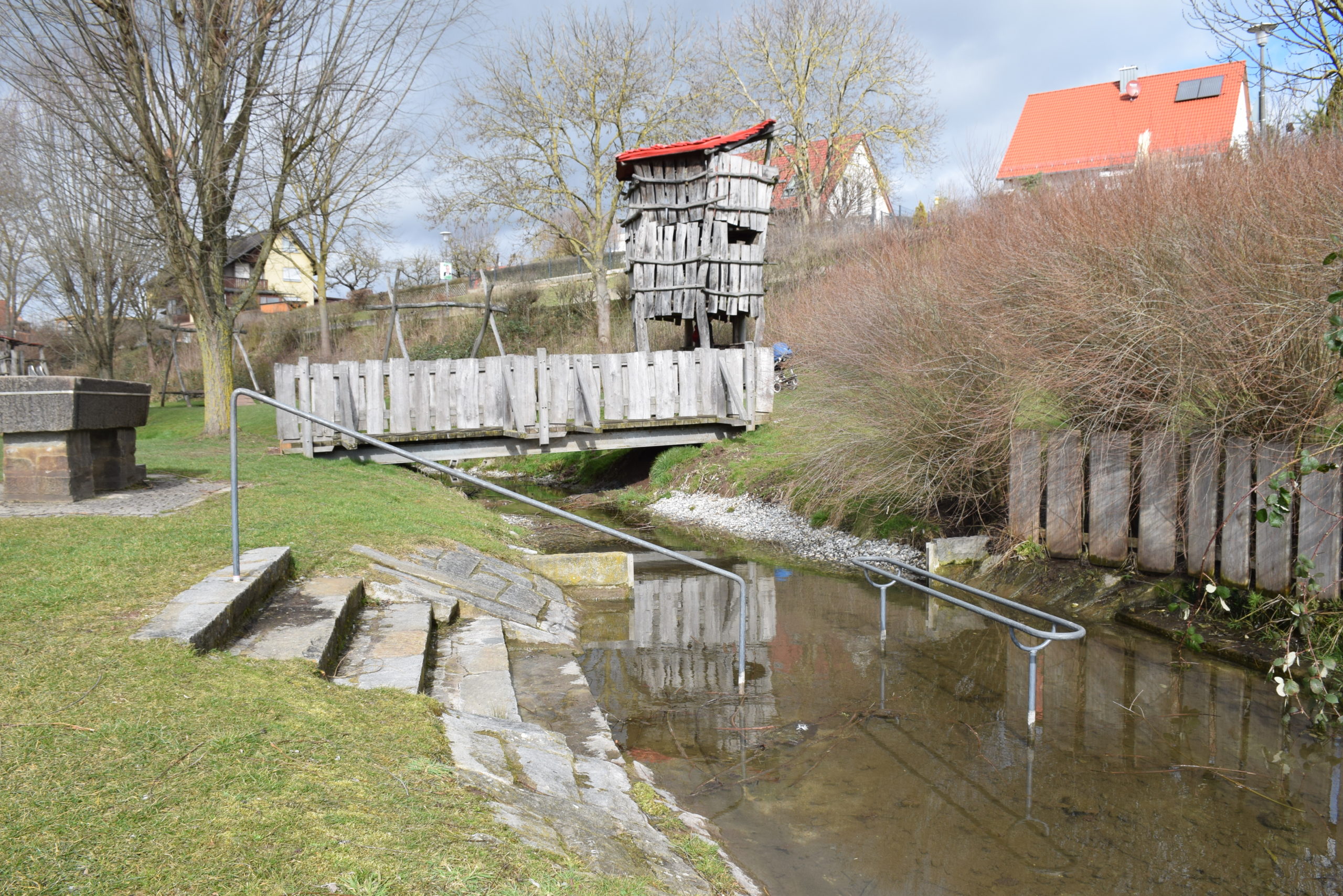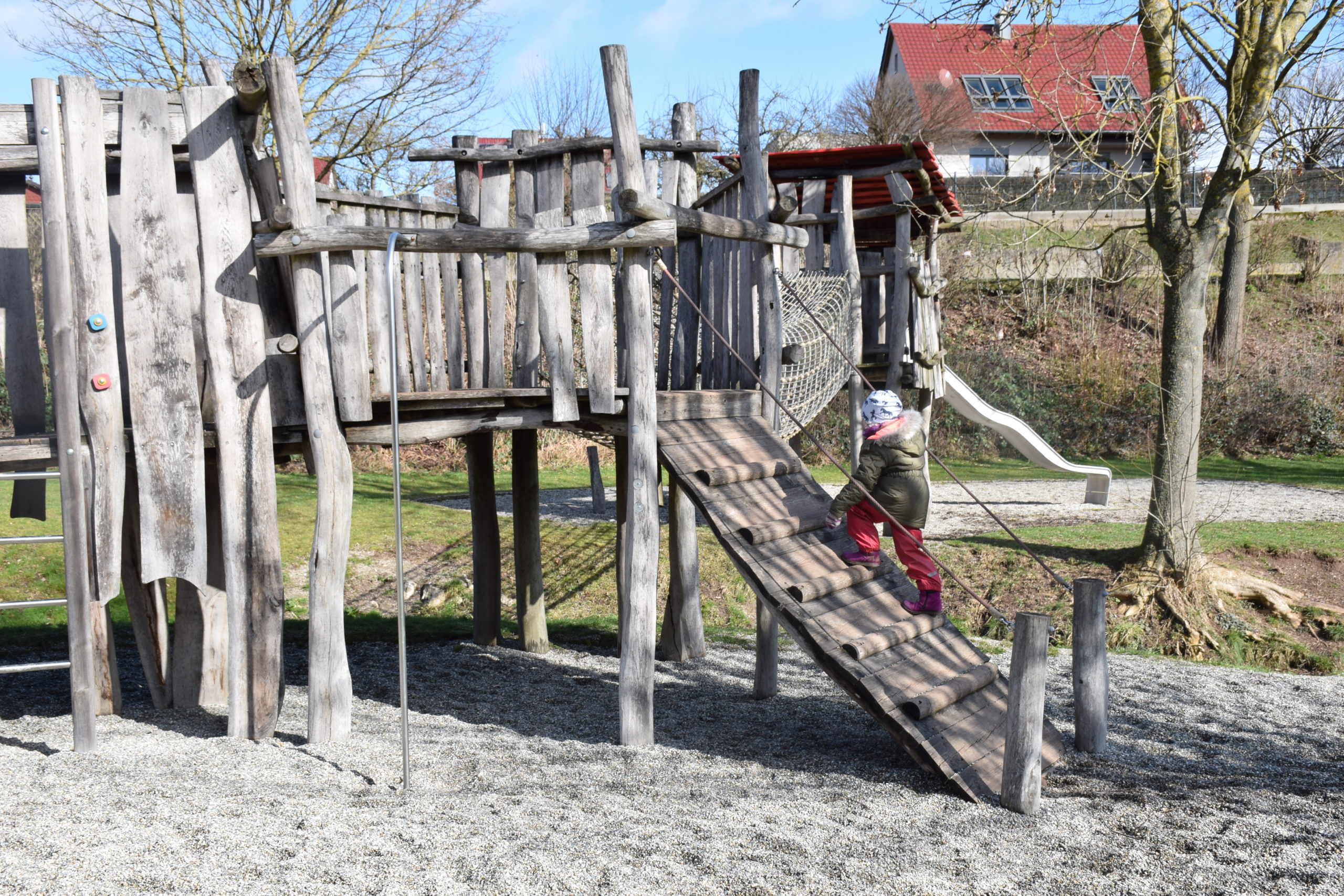 Klettertürme, Seilbahn, Bachlauf, Rutschen und Sand – hier ist einiges geboten. Für das Kneipp-Becken ist es Anfang März noch zu kalt. Aber wir können – während das Kind spielt – die Tafel über Victor von Scheffel, dem Verfasser des Frankenliedes, in Ruhe lesen. Und wir lernen, dass der eben gar kein Franke war, sondern ihn ein mehrwöchiger Aufenthalt auf Kloster Banz im Sommer 1859 zu seinem Gedicht „Wanderlust“ inspirierte. Erst später wurde es vertont und dann zum „Frankenlied“.