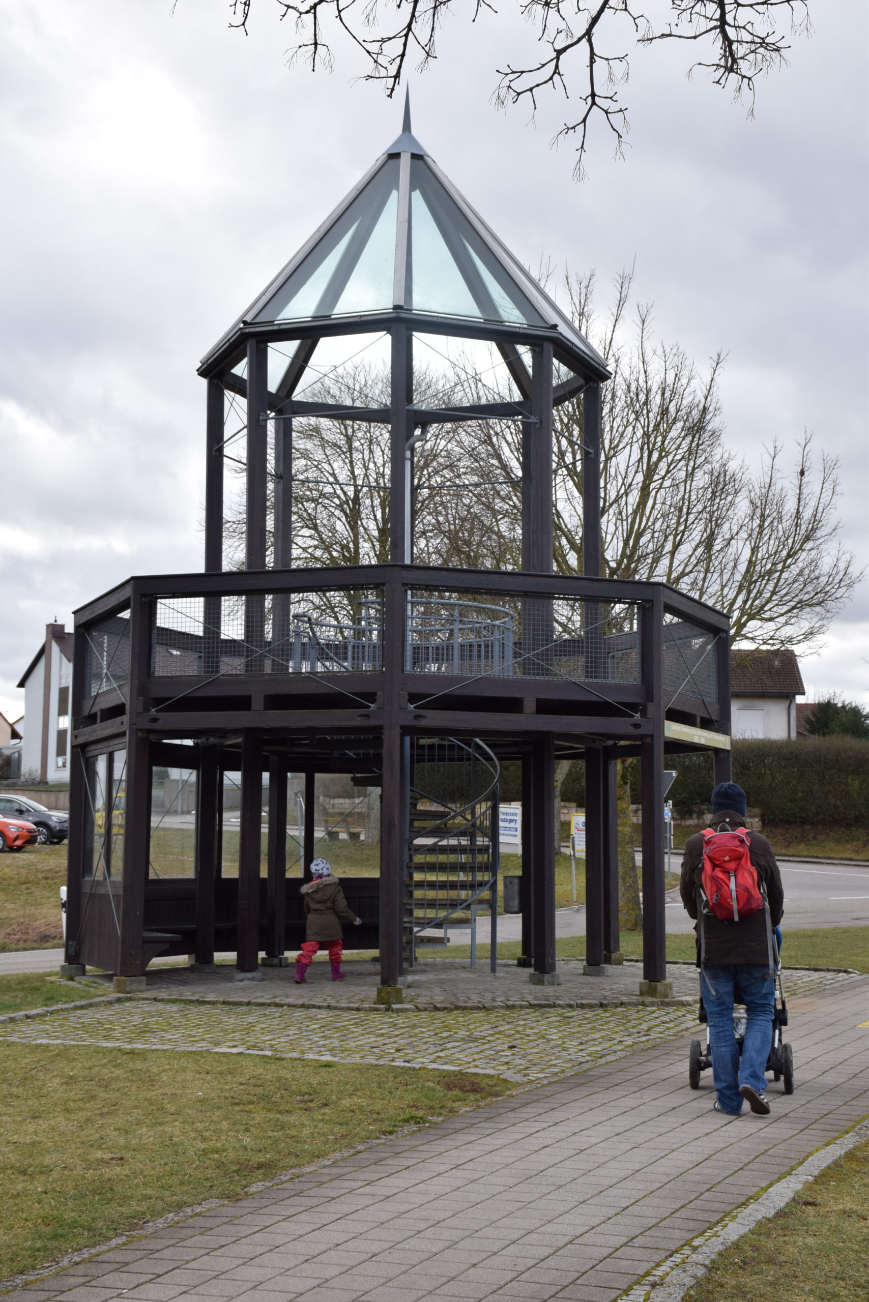 Nach der Spielpause geht es weiter um den Schießweiher herum. Wir werden wieder von einer Schar Enten begleitet, die offensichtlich hoffen, ein bisschen Brot abzubekommen. Am Weiher steht ein Aussichtsturm, der natürlich sofort erklommen wird. Von oben hat man einen schönen Blick auf Wolframs-Eschenbach.