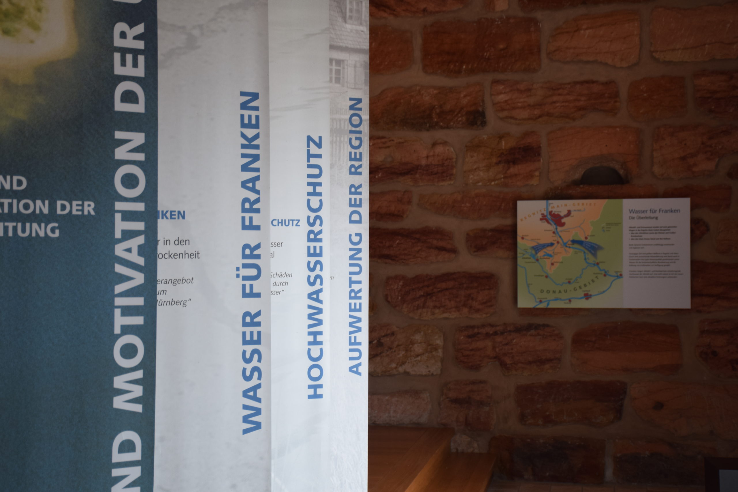 Das Fränkische Seenland ist das größte wasserwirtschaftliche Projekt Bayerns. Im ersten Stock des Infozentrums werden die Planung und Umsetzung des Projekts auf großen geschwungenen Tafeln beschrieben: vom Beschluss des Landtags 1970 bis heute. Wie es aussah als die Seen gebaut wurden, zeigen Filme, die auf Knopfdruck auf fünf Säulen loslaufen. Da schieben Bagger Dämme auf und Rohre werden verlegt. Im hinteren Bereich erläutern zwei Monitore und runde Schautafeln, wie das Wasser im Fränkischen Seenland Mensch und Natur verbindet.