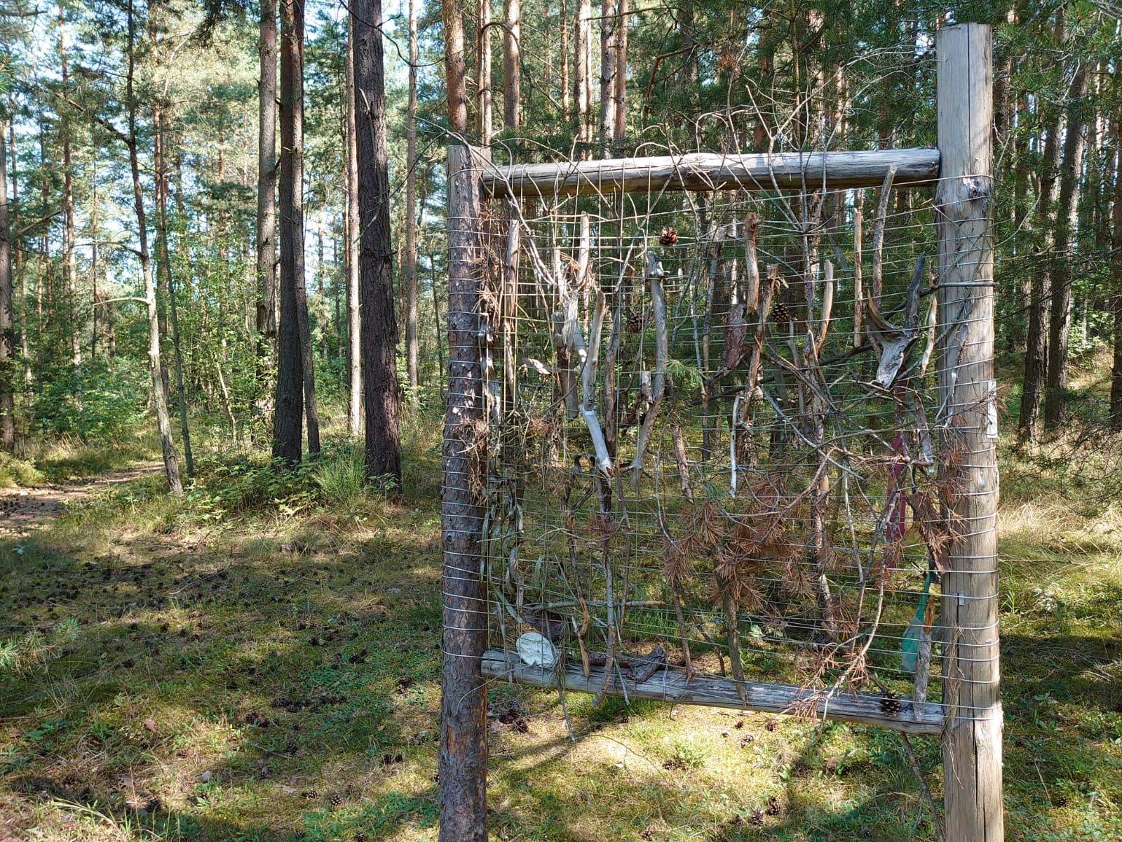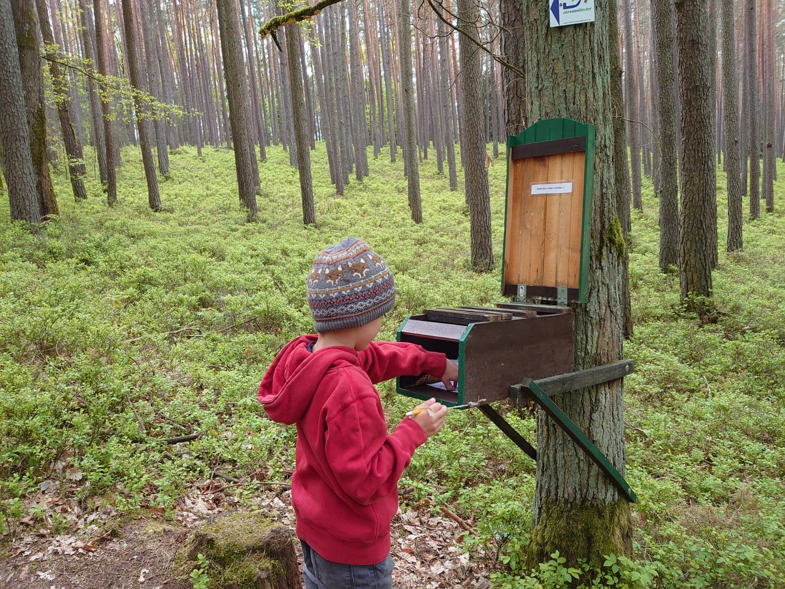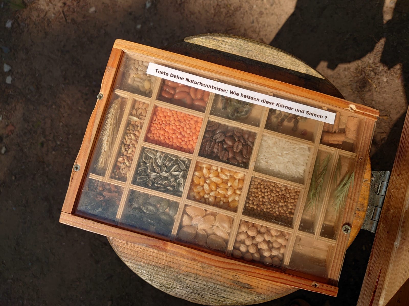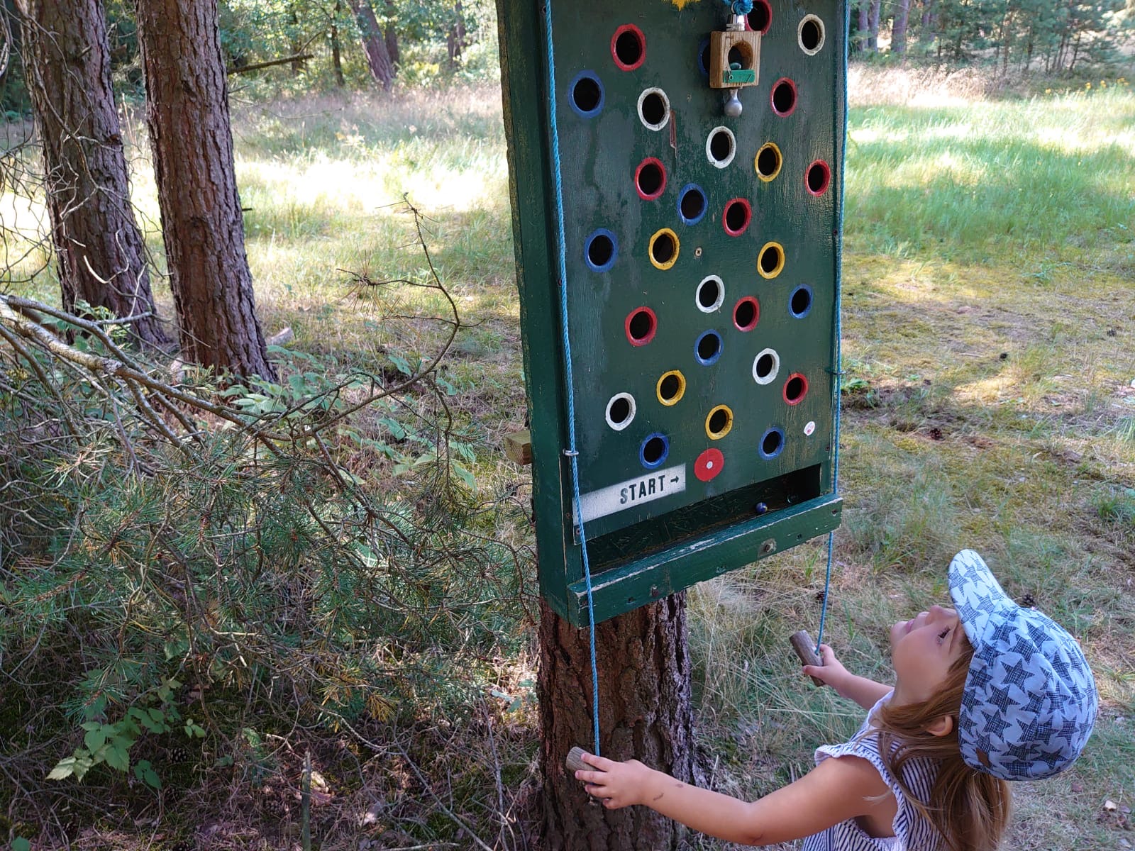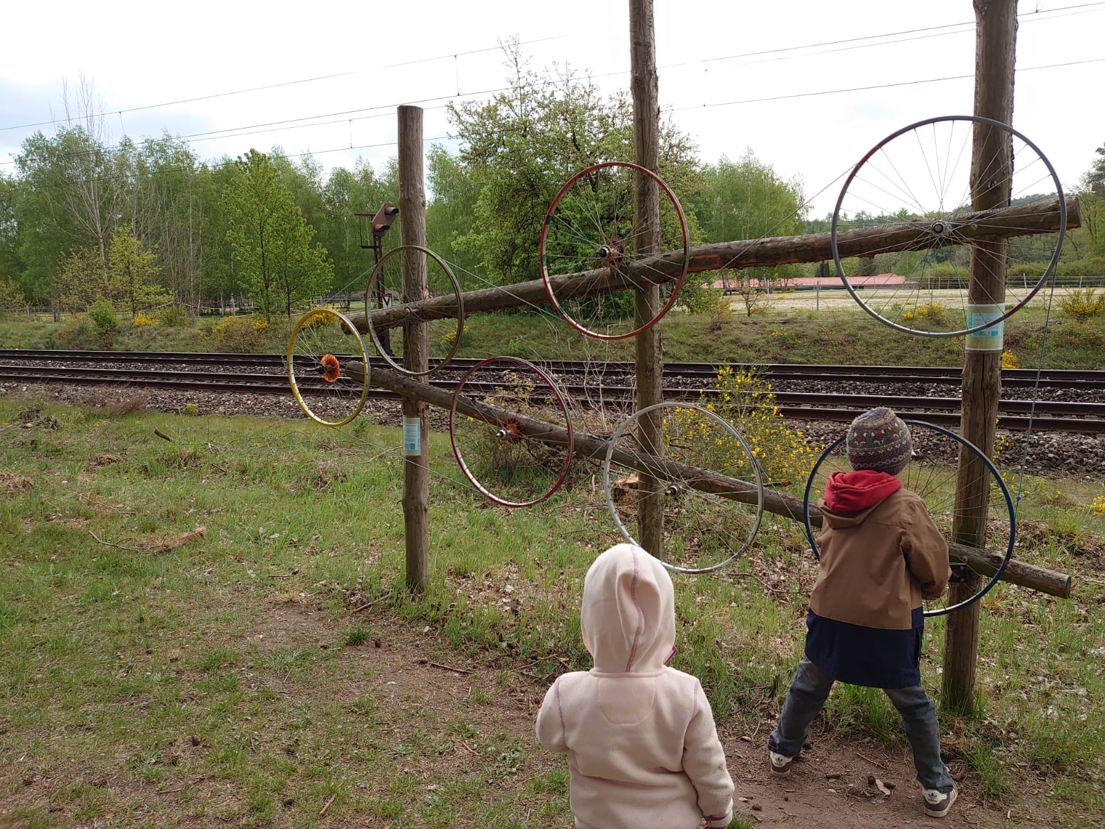 Parken kann man gut am Rastplatz Trafohäuschen. Dann einmal die Hauptstraße überqueren und am Feldkreuz an der Waldecke geht‘s auch schon los. Zuerst laufen wir immer dem Waldrand und den Gleisen entlang. Hier finden wir unter anderem Baumstämme zum Nägel reinhämmern, einen Aussichtspunkt mit Fernglas und eine sich drehende Konstruktion aus Rädern die uns stark an eine der verrückten Erfindungen von Petterson und Findus erinnert. Und immer wieder begleiten uns kleine Holzhäuschen mit verschiedenen Infos über Pflanzen oder den Wald.