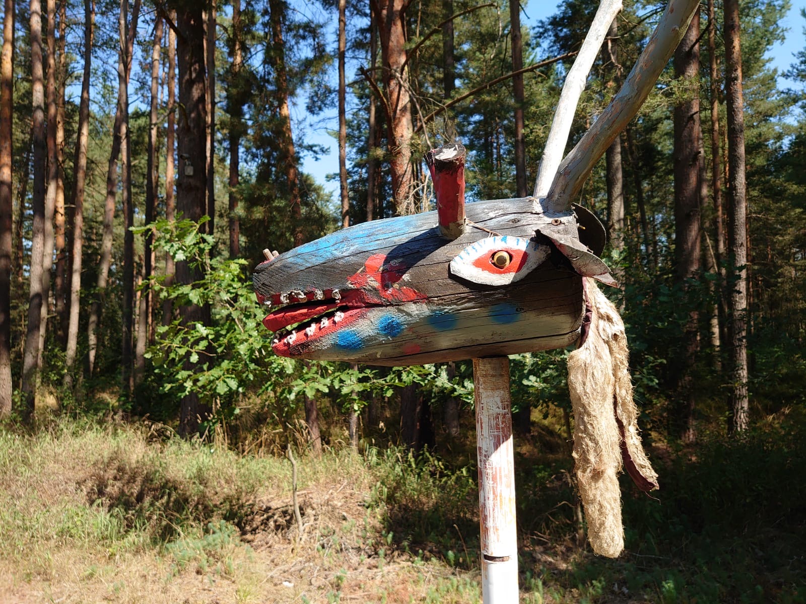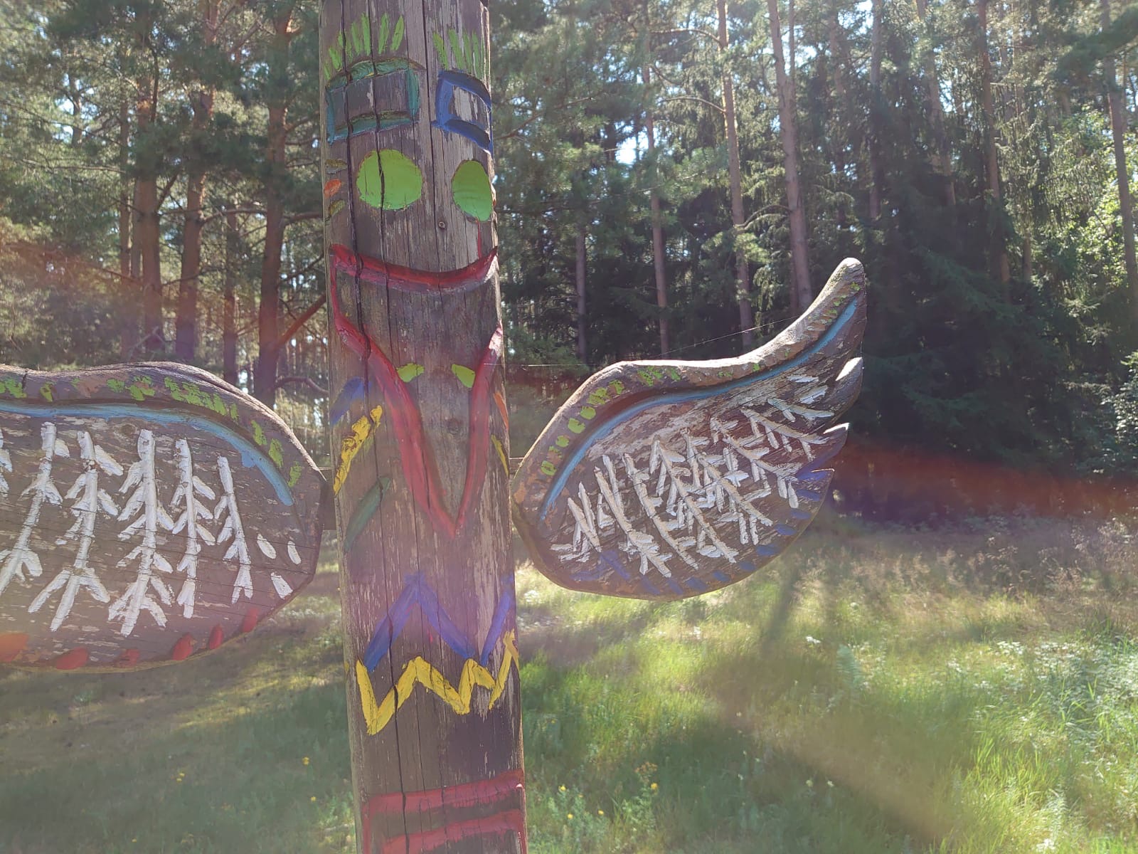Der Weg führt uns nun weiter an der Sandgrube entlang bis wir zu einer Abzweigung mit Totempfahl kommen. Hier ist leider sehr undeutlich beschildert, dass der Sandbockelweg auch noch geradeaus weiterführt. Auf den ersten Blick scheint es nämlich, als ob der Rundweg nur nach links in den Wald hinein geht.