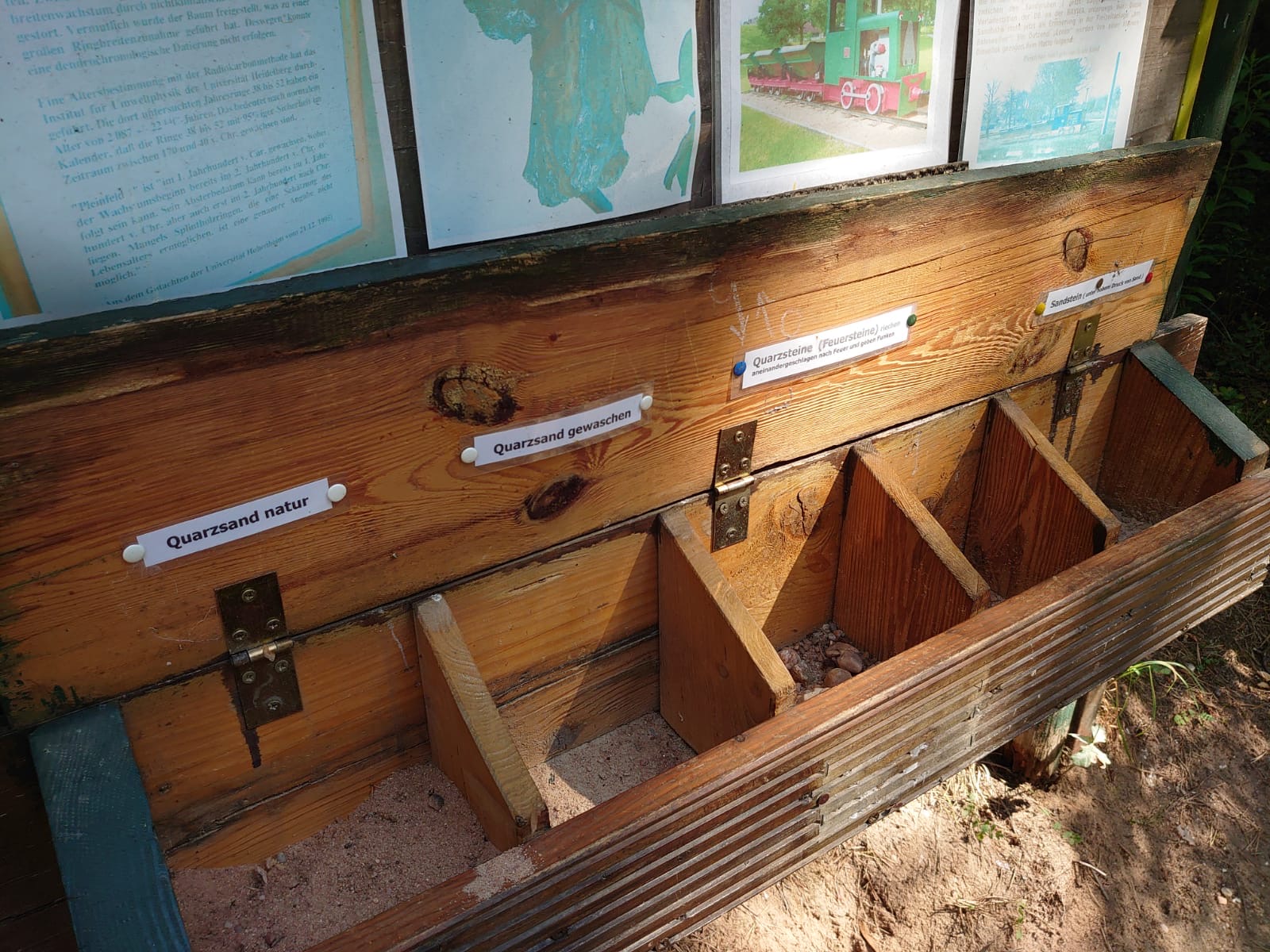 Der Wanderweg ist auch eine Hommage an die frühere Sandbahn. Diese zog hier in den 50er Jahren zwischen der Sandgrube und der Verladestation am Bahnhof ihre Bahnen. Immer mal wieder kriegen wir entlang des Weges kleine Einblicke in die Geschichte von damals und ein Teil des Weges führt uns sogar direkt an Bahngleisen entlang. Für die Kinder natürlich jedes Mal ein Highlight wenn ein Zug ganz nah an uns vorbeifährt. Wer allerdings den echten Bockl sehen will, der muss zum Spielplatz „Am Bahnweiher“ beim Bahnhof, dort erinnert der ehemalige Zug an seine kilometerlangen Fahrten. Übrigens gibt es an diesem Spielplatz einen großen Wasserspielbereich zum Plantschen – falls man nach der Wanderung noch eine Abkühlung sucht!