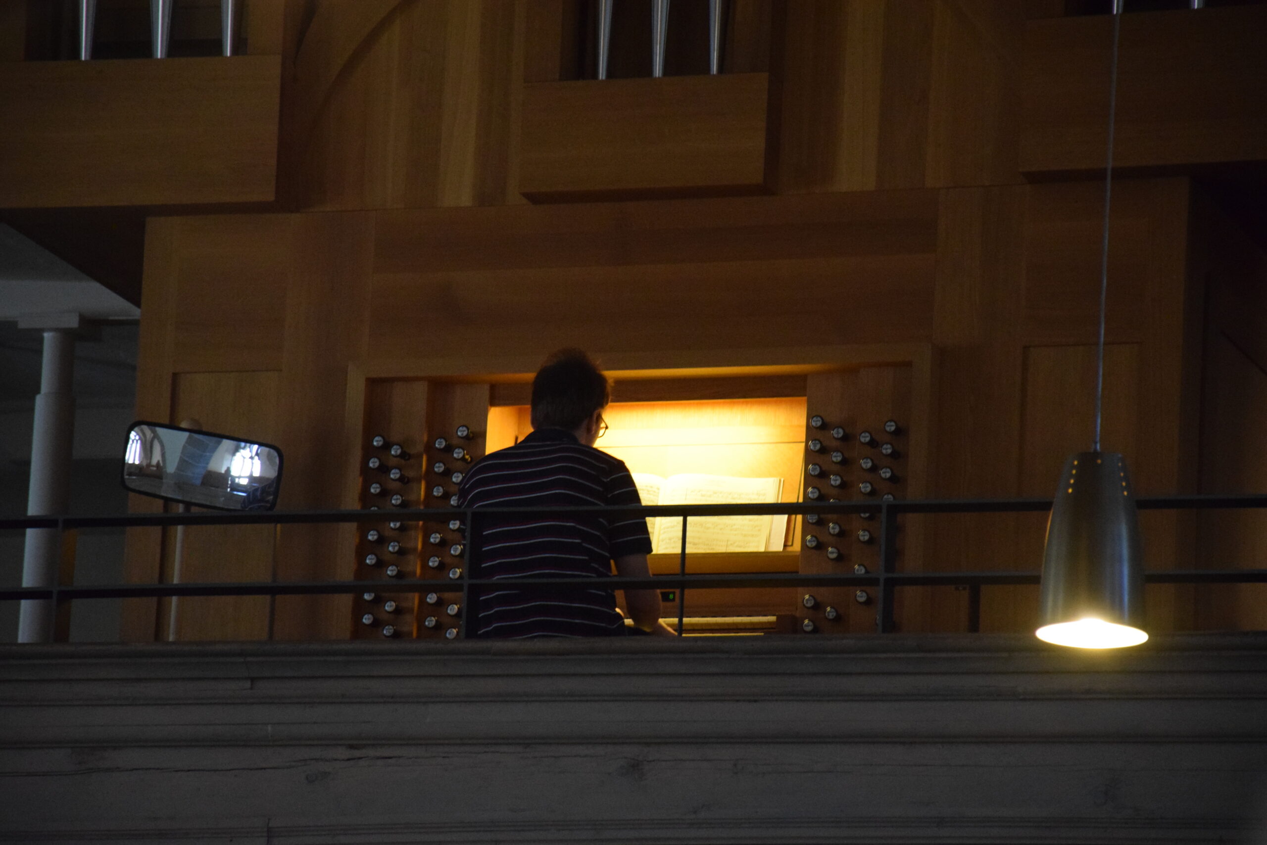 Timm Grummich fängt an zu spielen: „Nun danket alle Gott“ von Johann Sebastian Bach. Und sofort sehe ich den Besuchern an, wie sie sich entspannen und die kurze Auszeit mitten im Alltagstrubel genießen. Und auch ich kann mich zurücklehnen und genießen. Die Musik wird garniert mit einem „Impuls“. Einer kurzen Geschichte, die vorgetragen wird. Nur ganz kurz – aber zum Nachdenken. Die Menschen sind aber vor allem hier, um die Musik zu hören.
