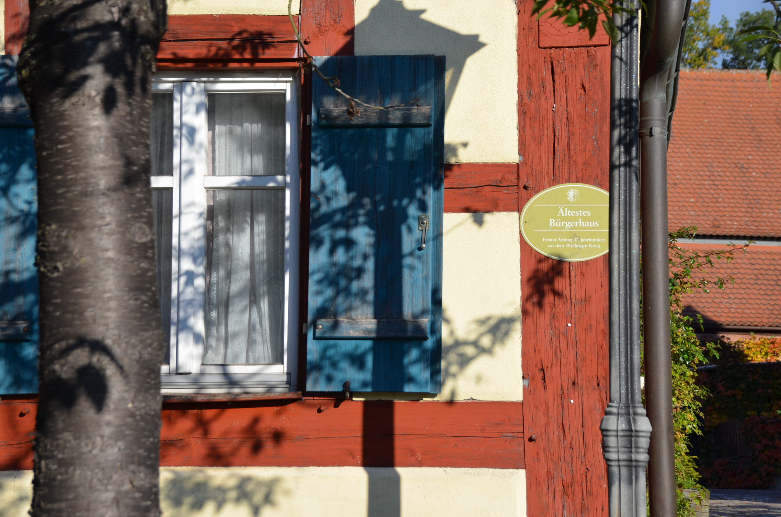 Der Weg führt uns aus Dürrenmungenau wieder hinaus durch das etwas unscheinbare Beerbach hindurch in Richtung Pflugsmühle. Das Wetter ist übrigens großartig. Perfekte Wanderbedingungen. Überall fliegen die bunten Herbstblätter um uns herum und ein kleiner Bachlauf begleitet uns mit wehenden Schilfhalmen.