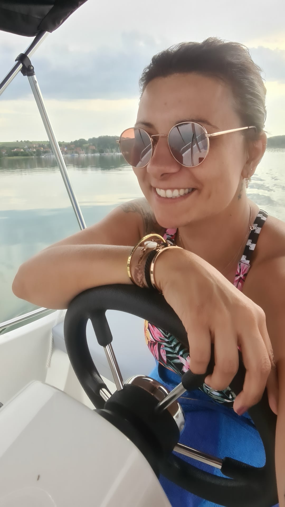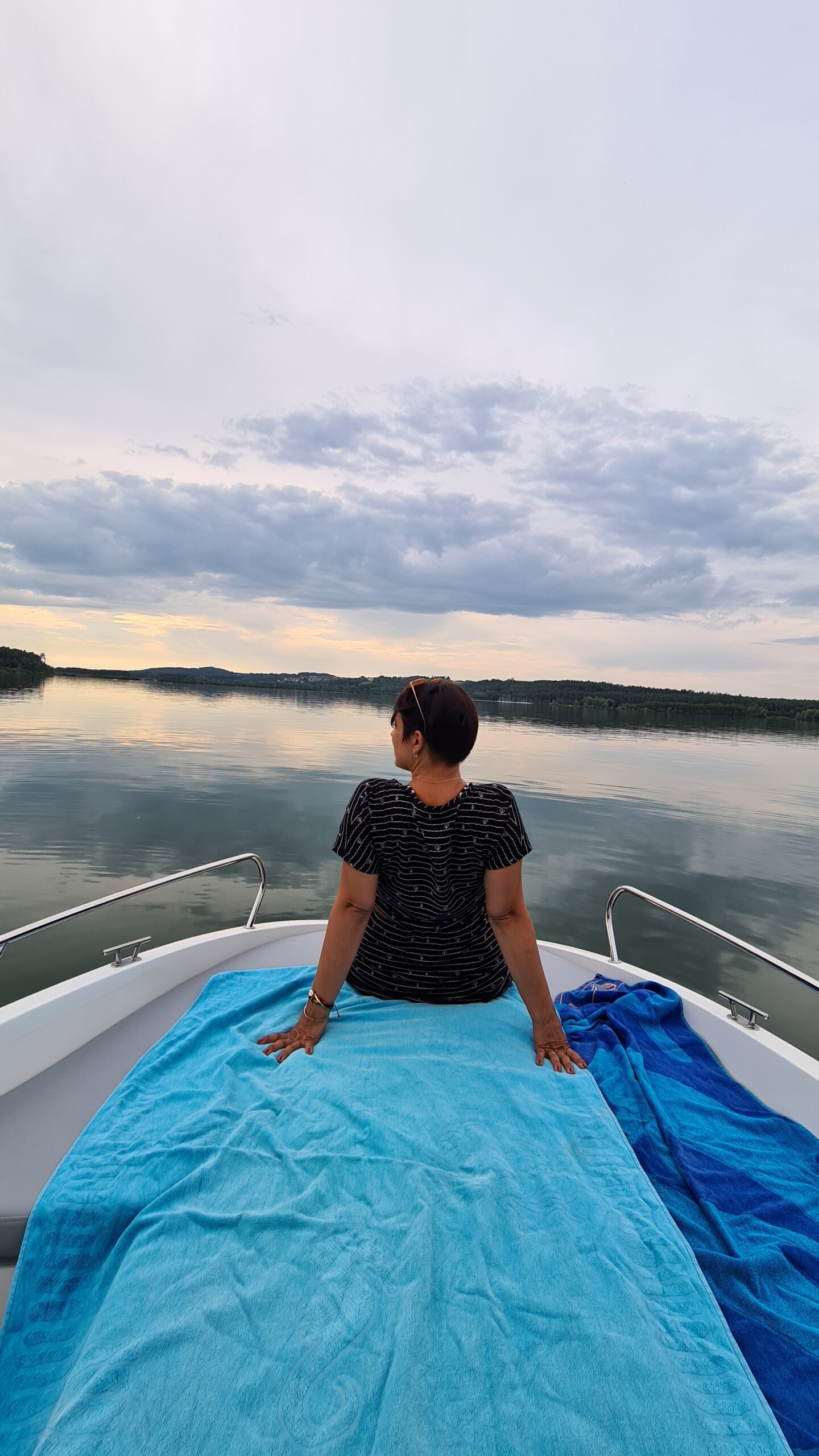 Mit gemütlichen 3 PS und leisem Motor glitten wir auf dem abendlichen Brombachsee dahin, suchten uns eine hübsche Stelle und schlemmten die Köstlichkeiten aus der vegetarischen Seenland-Kiste. Nach dem Essen sprangen wir noch ins Wasser, kletterten über die Leiter wieder ins Boot und streckten uns gemütlich auf der Liegefläche aus.