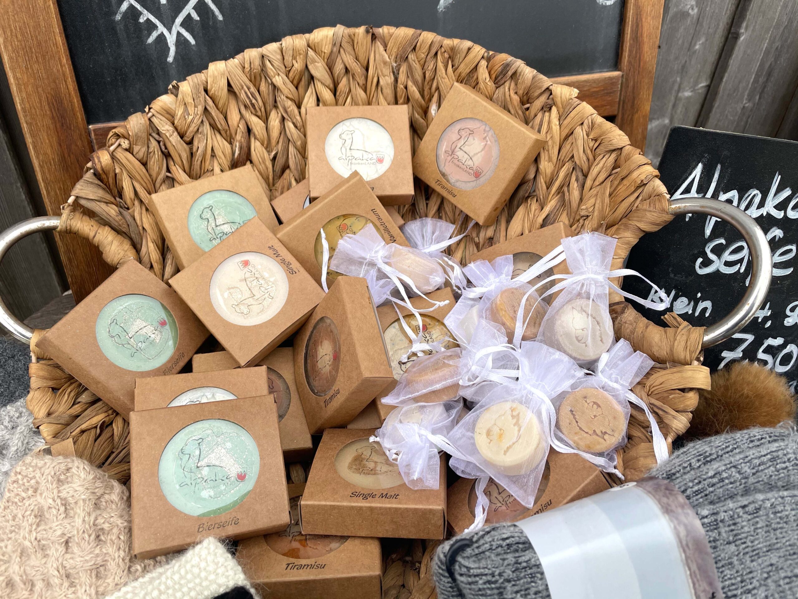 Nach der Wanderung hatten wir, wie oben schon erwähnt, noch die Möglichkeit die kleinen Alpakajungen zu streicheln und uns von den Tieren auf der Weide zu verabschieden. Im Stall ist außerdem immer ein kleines Hoflädchen mit einem kleinem, aber feinem Sortiment aus Produkten aus Alpakawolle aufgebaut. Hier findet man kuschelige Mützen, süße Socken, verschiedene Seifen oder auch Bio-Dünger. Die Wolle der eigenen Alpakas vom Frankenland Hof wird zu Strickwolle verarbeitet welche man dann als Wollknäuel kaufen kann. Unsere Kinder haben sich für ein kleines Bastelset und einen Alpaka Sticker entschieden. Alles in allem sollte man bei einem Besuch mit Wanderung und Vesperpause um die drei Stunden einplanen. Und man sollte sich im Klaren sein, das die nächsten Tage über nichts anders geredet wird, als über flauschige Alpakas ;).