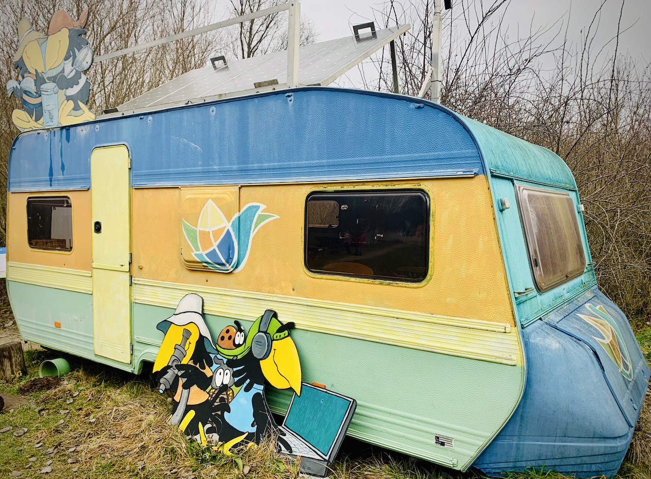 Uns begeistern auf jeden Fall die leuchtenden Farben in dem ganzen Grau. Und wir sind uns einig: Sollte unser Wohnwagen (wir sind begeisterte Camper, mehr dazu könnt ihr hier lesen) mal den Geist aufgeben, dann machen wir daraus auch ein kunterbuntes Büro und stellen es in unseren Garten.