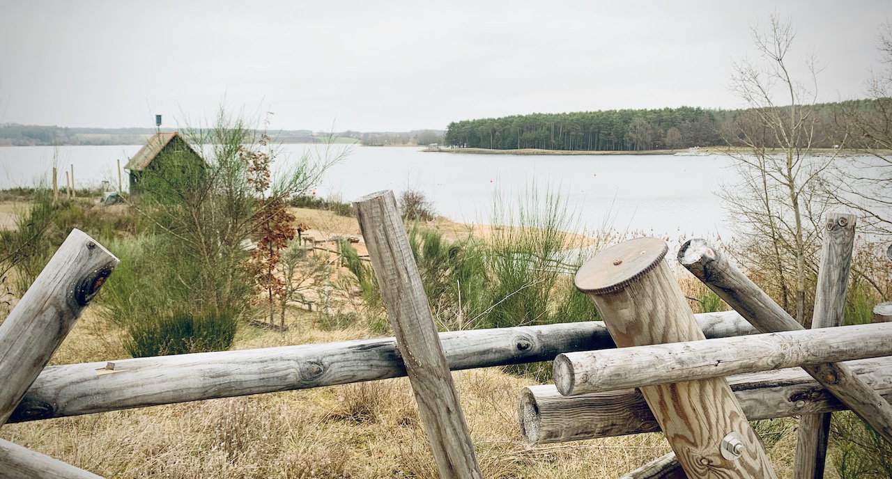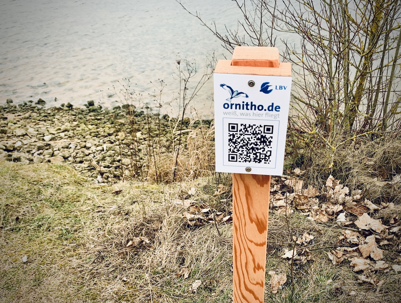 Lieber schnell aufstehen und die Aussicht an der Spitze der kleinen Landzunge genießen. Mit Fernrohren sehen wir die Enten und Blässhühner auf dem See schwimmen. Und ein QR-Code von ornitho.de ermöglicht es zu sehen, welche Tiere sich die letzten 15 Tage hier so rumgetrieben haben.