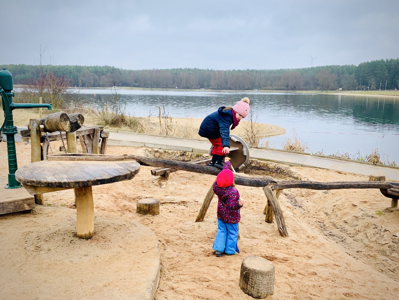 Für den Abschluss haben wir uns den Wasser-Matsch-Spielplatz aufgehoben. Auch wenn die Pumpenanlage abgestellt ist: die Sauerei bleibt. Der Sand ist aufgrund des Wetters sowieso feucht, in den Rinnen hat sich Wasser gesammelt und an den langweiligen Stellen kann man ja auch klettern. Erst beim Aufmachen der Thermoskanne merken wir, wie kalt es eigentlich ist. Bis dahin hatten wir das ganze Grau ziemlich vergessen.