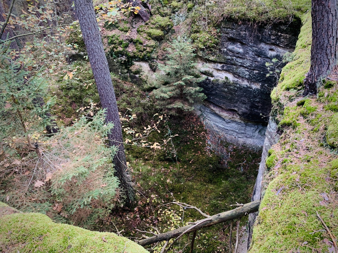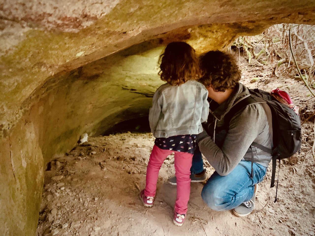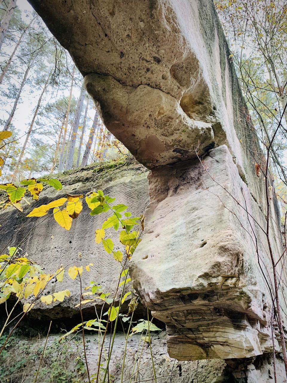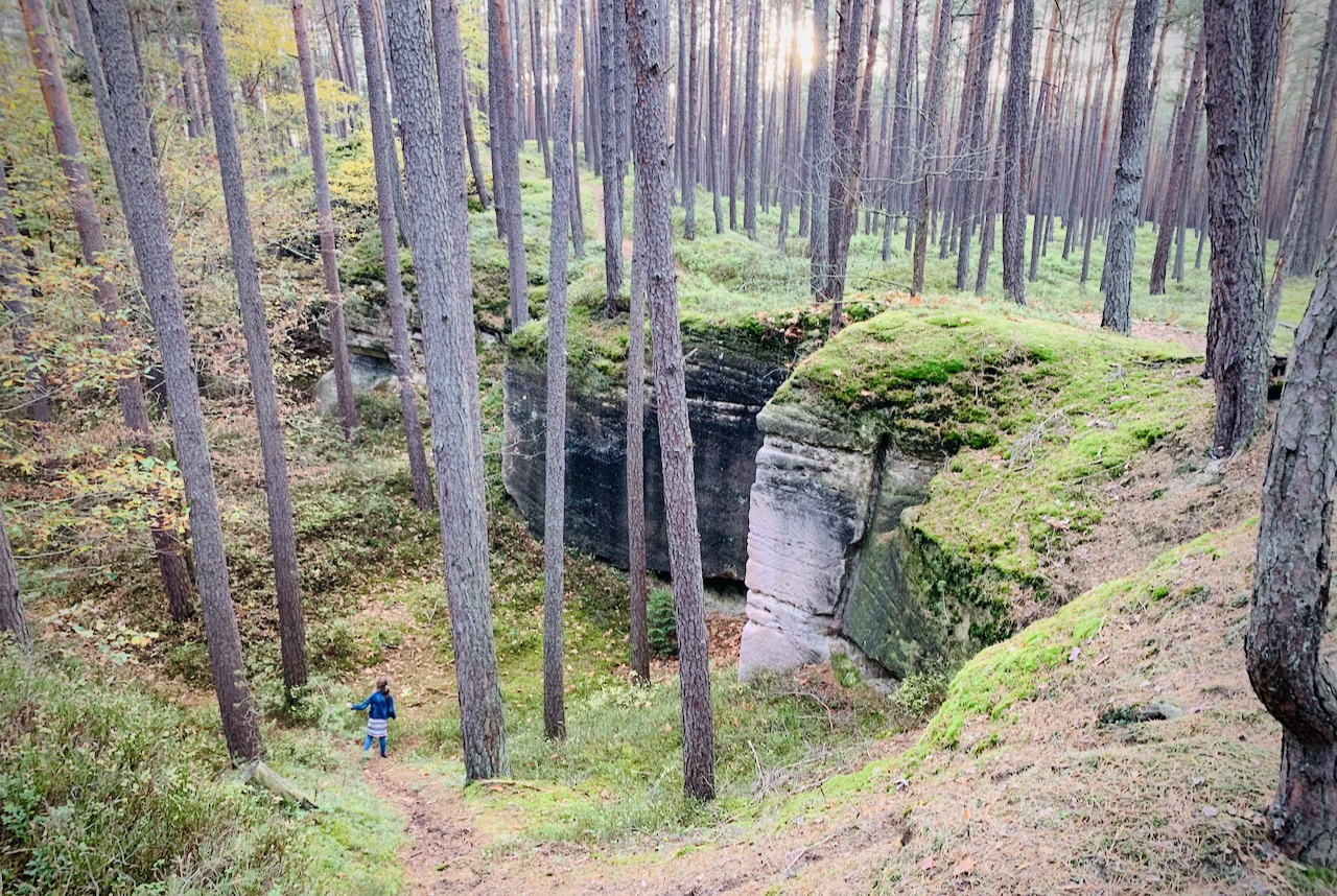 Wir sind jedenfalls sprachlos. Die Karten verschwinden in den Taschen und wir stehen ehrfürchtig unter einem riesigen Steinbogen. Dann geht es los mit dem Entdecken: Hang rauf, Hang runter, da ist eine echte Höhle, wer traut sich reinschauen? – Ahhh, da leben ja richtig echte Tiere. – Ja, das ist im Wald üblich. – Warum? – Ähm, weil sie nicht tot sind. – Aber Mama, wir brauchen noch was Totes! – Ja, aber vielleicht nicht direkt von hier… Und schwupp, ist eine Stunde rum und es wird langsam dämmrig.