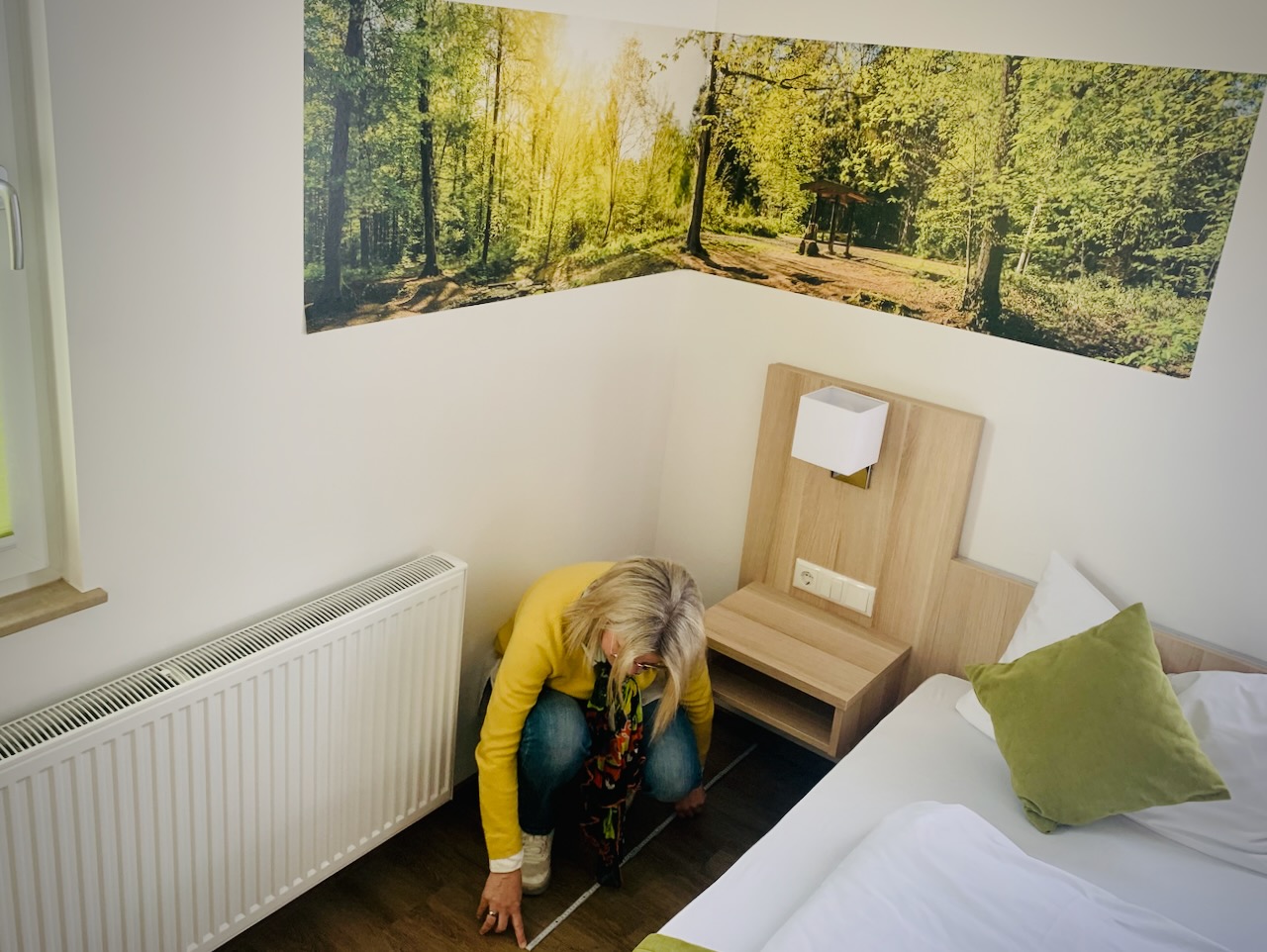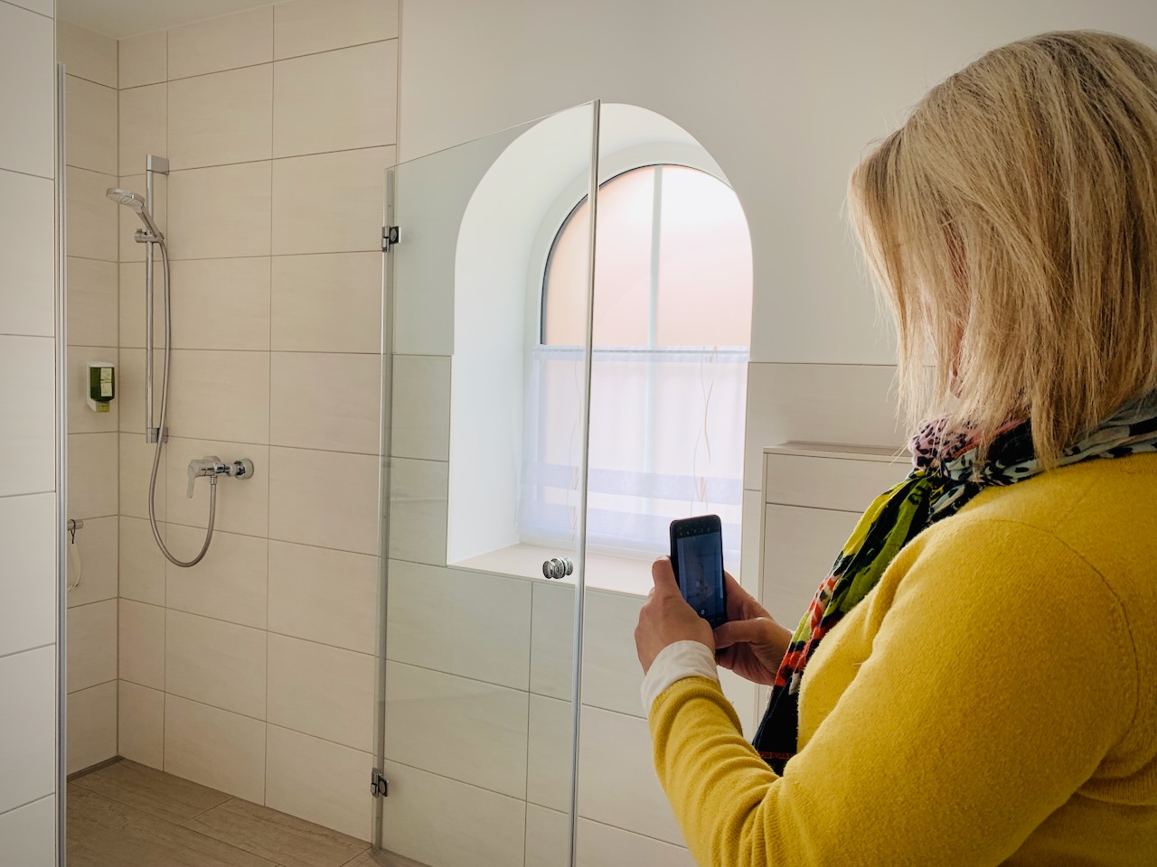 Dann geht es weiter in die Schlafräume und Badezimmer. Auch hier: keinerlei Beanstandungen: fest eingebauter Safe, genügend Kleiderbügel und Stauraum, Steckdosen neben den Betten, wieder Flachbild-TV, ausreichend Handtücher, genügend Ablageflächen, ebenerdiger Duscheinstieg… Frau Schwarz dokumentiert alles, macht entsprechend Fotos und misst die Daten vom bereits eingereichten Grundriss nach. Perfekt. Und es regnet quasi Punkte um Punkte.