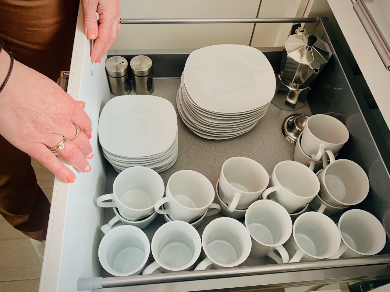 Frau Schwarz erzählt dagegen, dass sie bei einem anderen Termin gesehen hat, dass die Gastgeberin für jede Ferienwohnung eine andere Geschirrfarbe gewählt hat – um Teller und Schüsseln ganz leicht den einzelnen Wohnungen zuzuordnen. Die Idee findet Frau Winner toll, werden ihre Unterkünfte doch auch häufig von mehreren Familien gemeinsam belegt und damit natürlich auch gemeinsam gegessen. Letztendlich ist es nach der Abreise immer wieder eine aufwendige Arbeit, jeder Wohnung genügend bzw. das entsprechende Geschirr zuzuordnen.