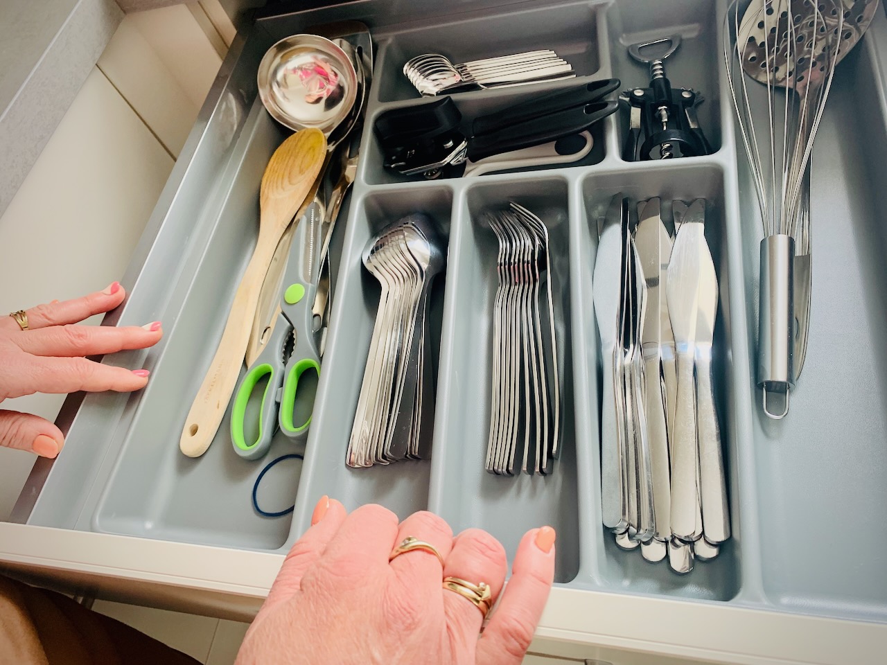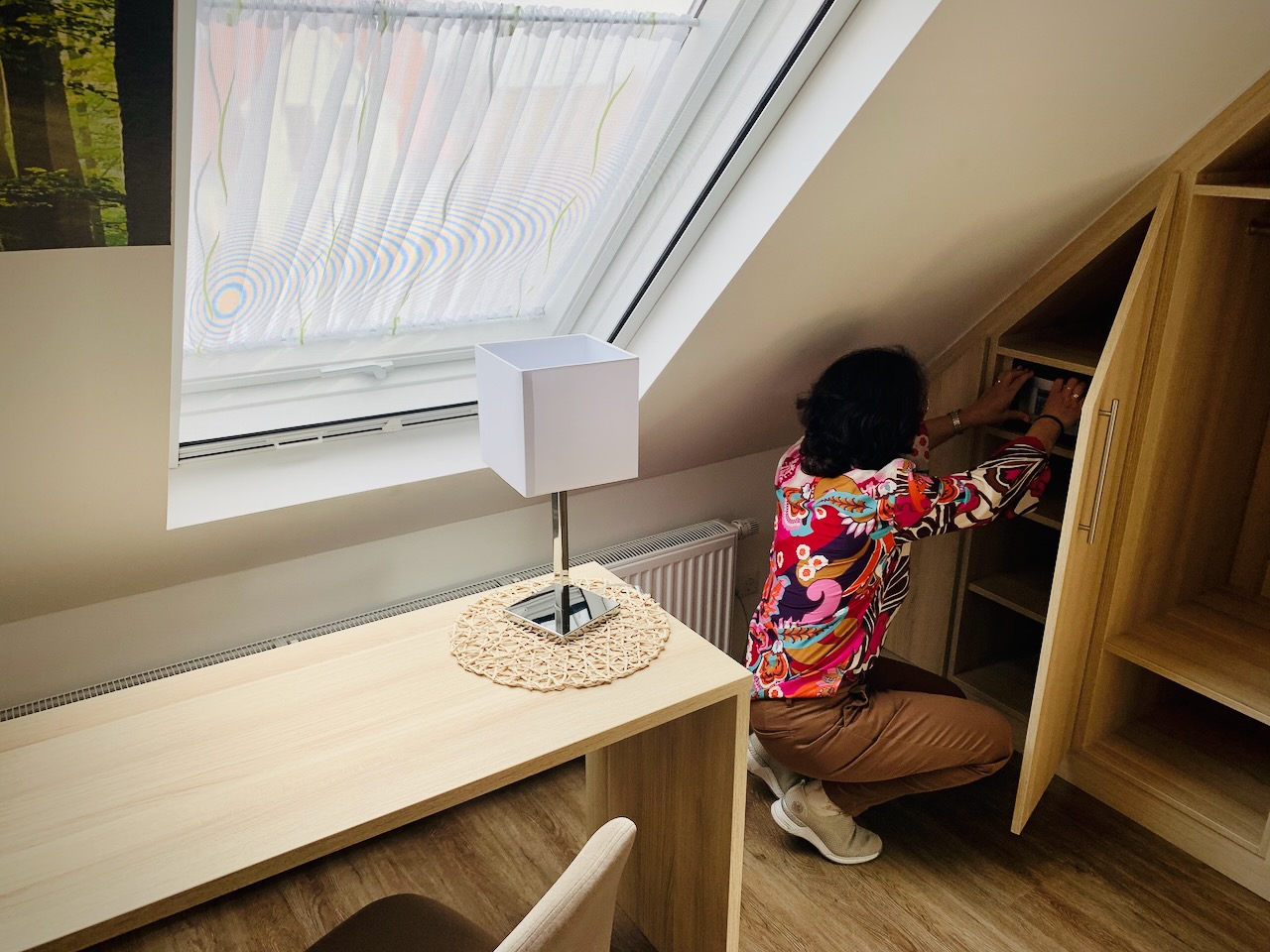 Dazwischen ist immer wieder Zeit für ein Beratungsgespräch und Erfahrungsaustausch. Bei den Kleiderbügeln hat Carmen sich für die Hotelvariante entschieden: also fest verankerte Halter mit der Schrankstange. Es sind einfach zu viele weggekommen.