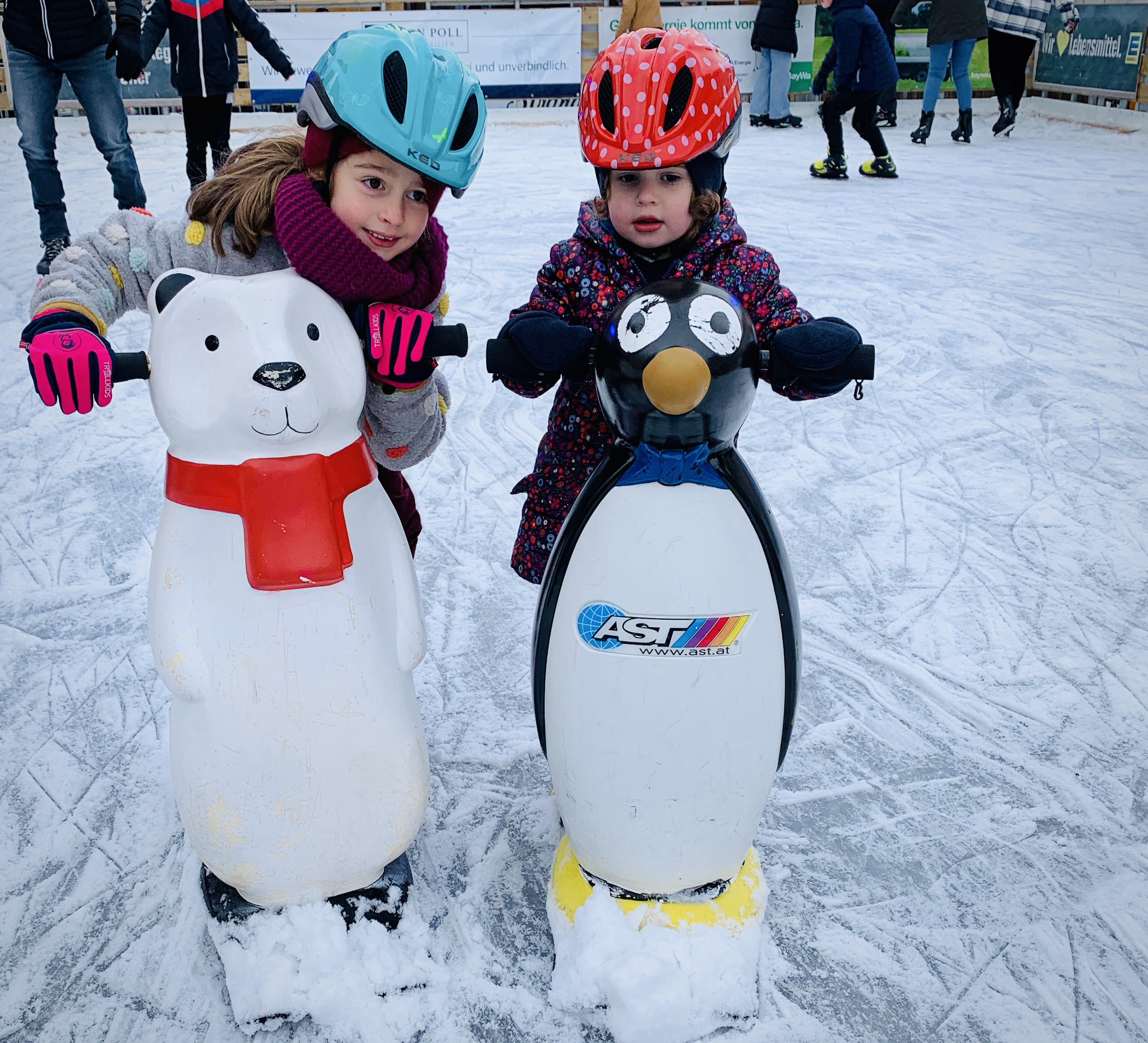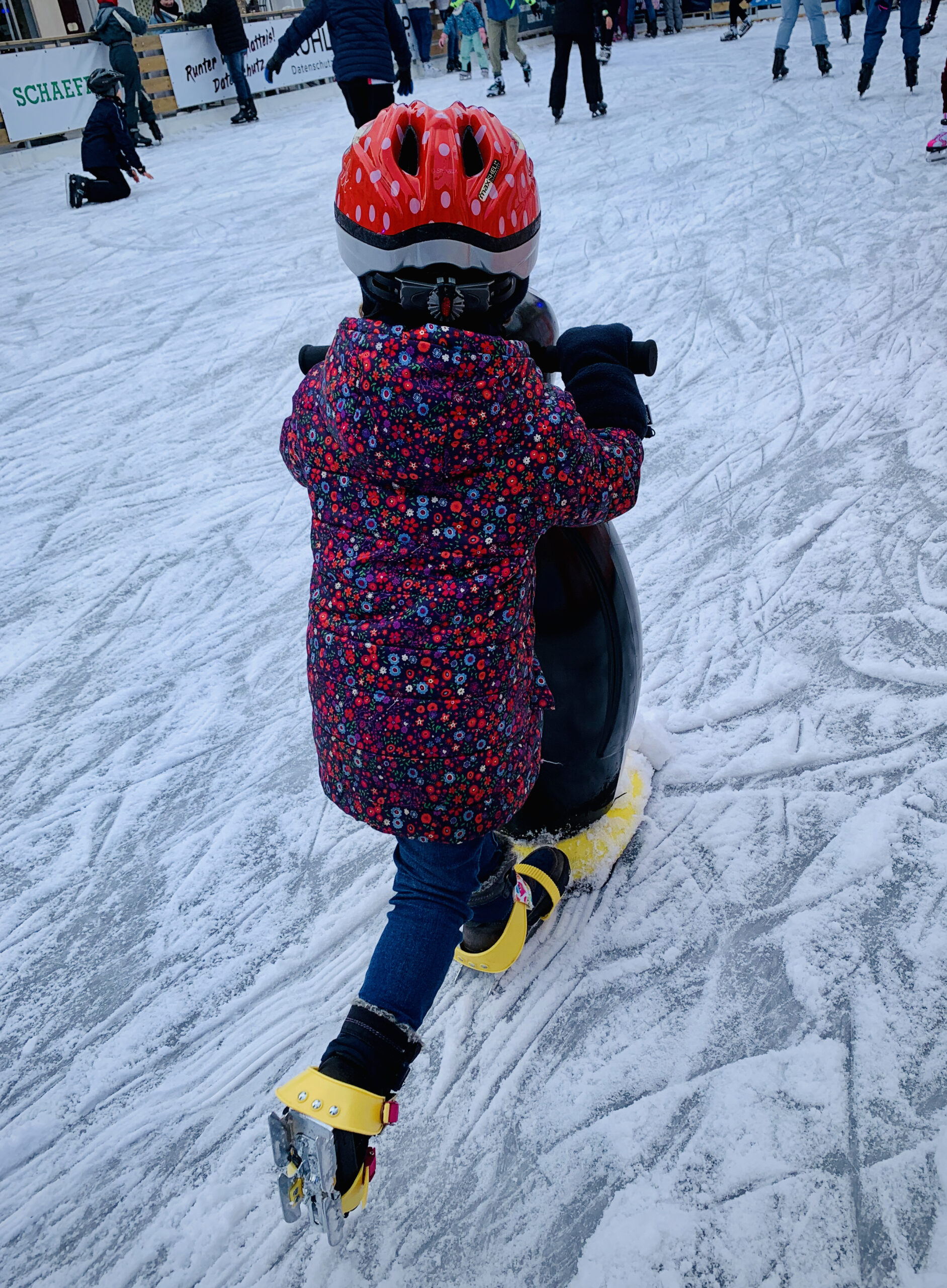 Aber was soll’s: Mittlerweile will die Kleine doch hier bleiben und kann das bestimmt schon alleine – was natürlich nicht gut geht. Doch da kommt die Rettung in Form eines Pinguins. Diese Eispinguine sind mit zwei Griffen ausgestattet und rutschen perfekt mit übers Eis. Das absolute Highlight für unsere kleine Anfängerin. Damit kann sie selbst ihre ersten Versuche machen und fühlt sich gleich viel besser.