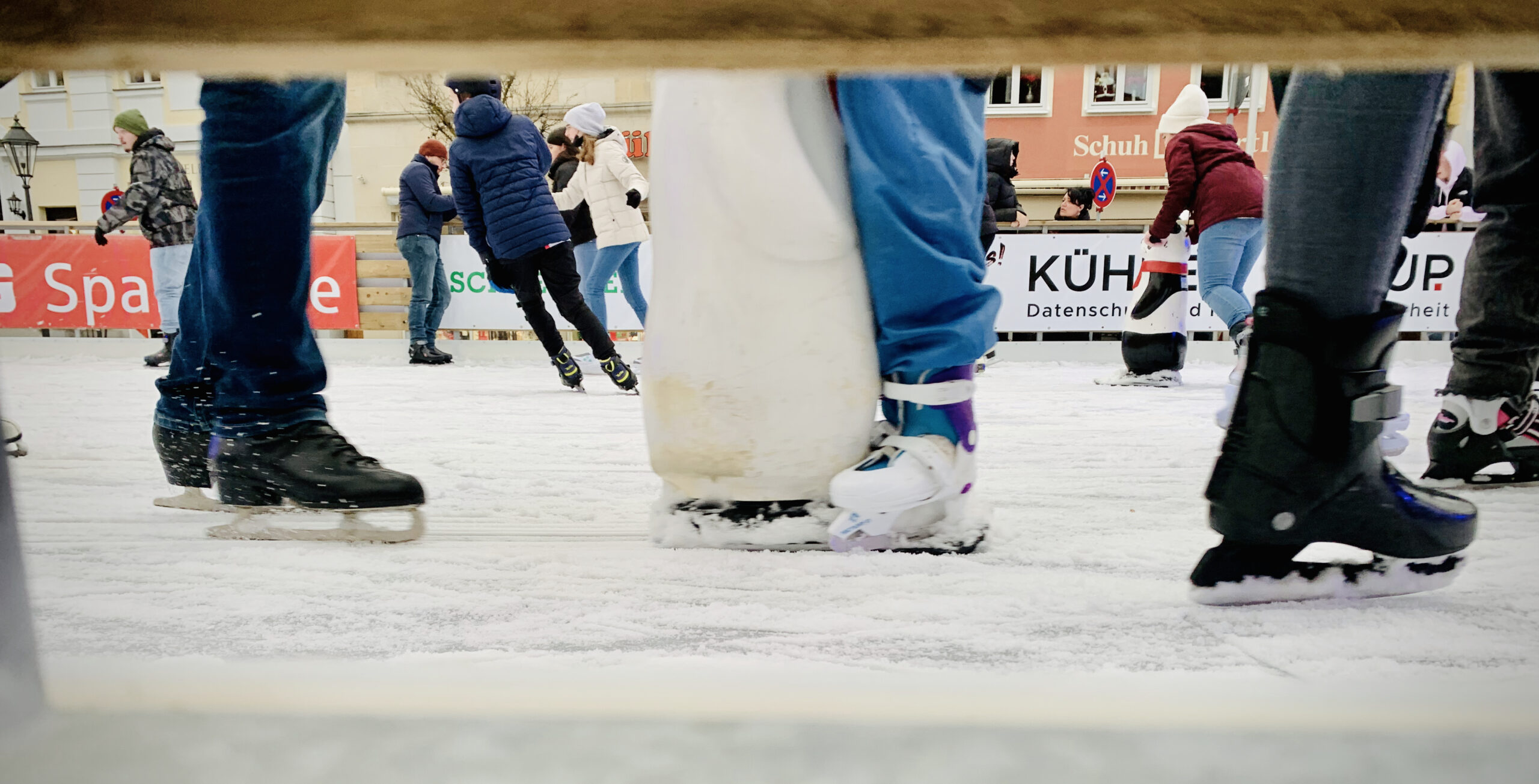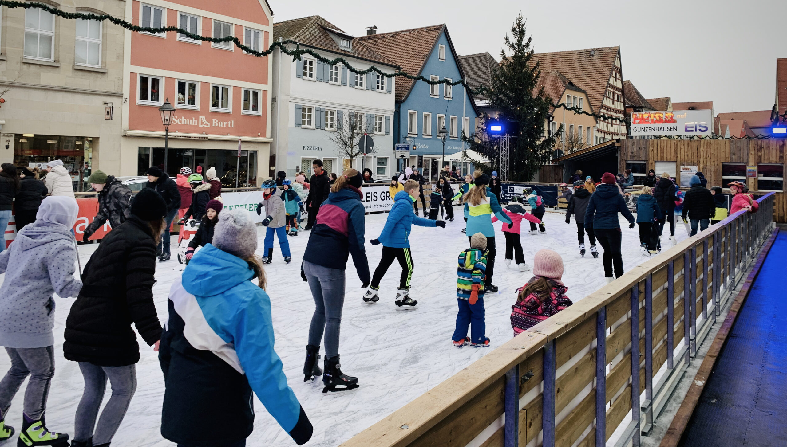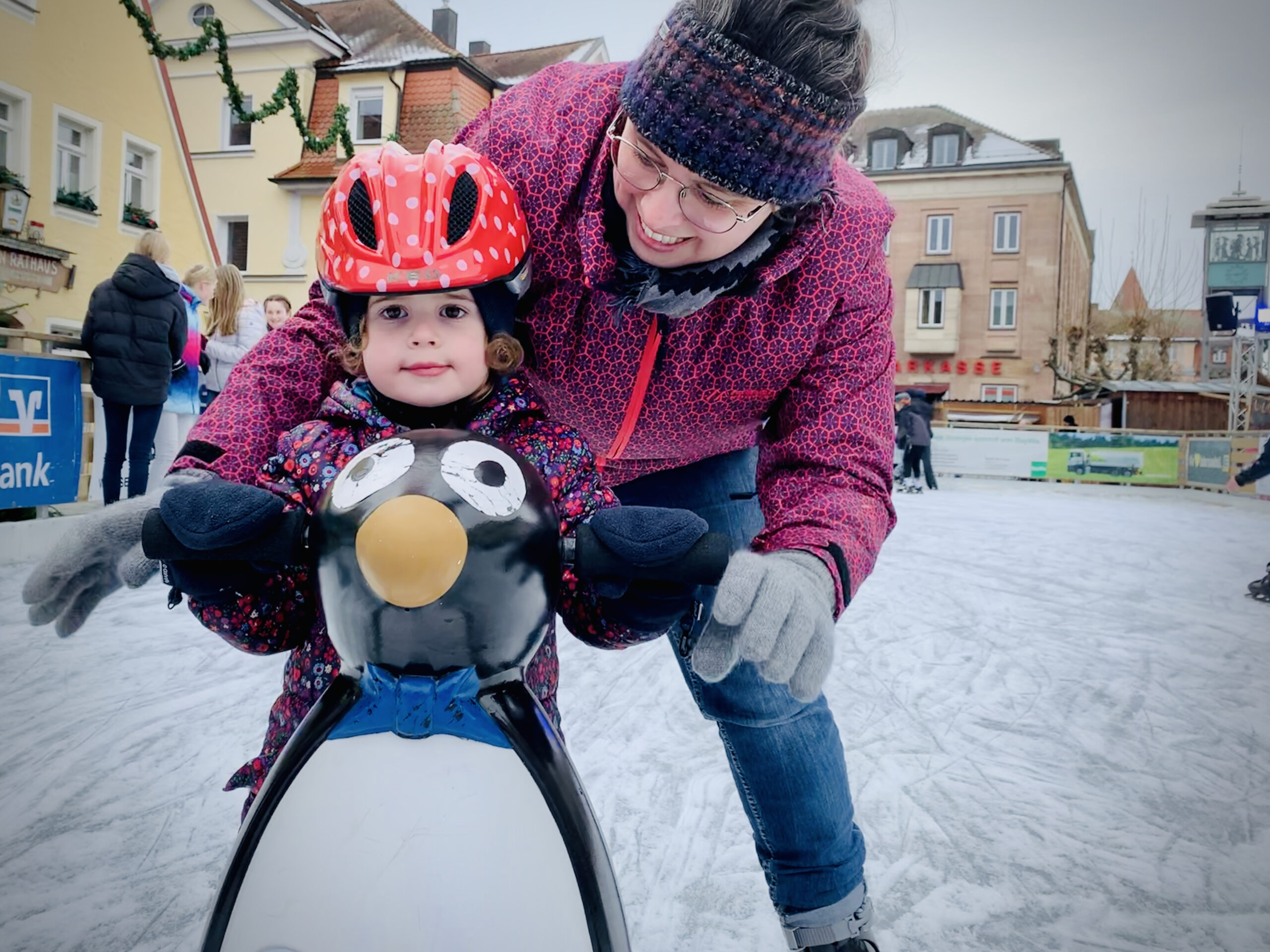 Winter = verschneite Landschaften, Schlittenfahren, Eislaufen und Schneemann bauen? Bis jetzt in diesem Winter leider nur ein kurzes, wenn auch wunderschönes Gastspiel. Denn irgendwie hält sich das liebe Wetter immer weniger an unsere winterlichen Traumvorgaben. Doch die Stadt Gunzenhausen nutzt diese Winternot geschickt. Kein klirrekalter Winter? Keine zugefrorenen Weiher? Egal für die Altmühlstadt. Man holt sich das Winterfeeling einfach mitten auf den Marktplatz und gönnt sich seit einigen Jahren – trotz immer wieder kritischer Stimmen – rund 8 Wochen lang in der Advents- und Weihnachtszeit eine Eisbahn. Und wir sind, wie so viele andere, begeistert – trotz Muskelkater und Rückenschmerzen.