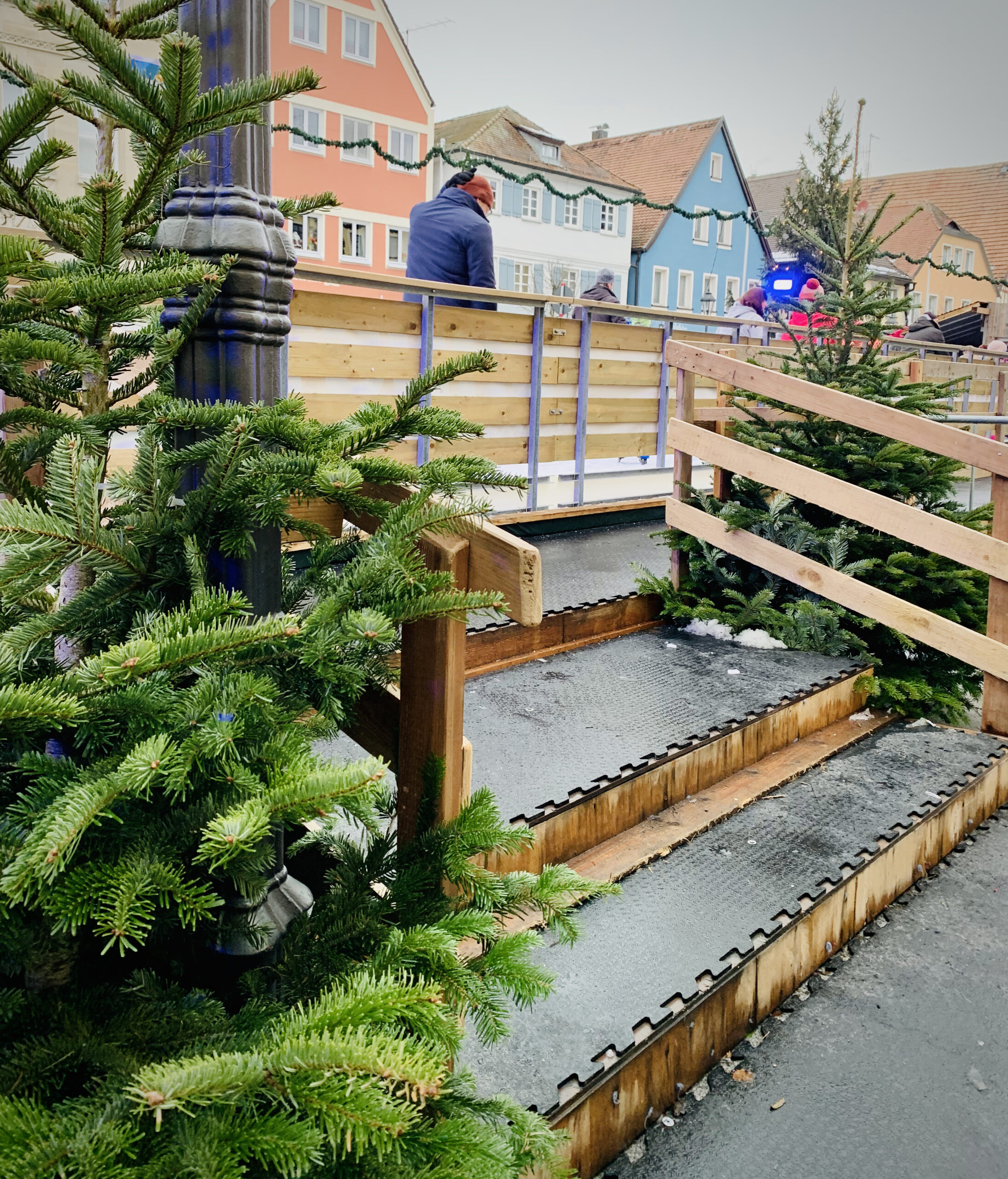 In Gunzenhausen spannt sich bereits an riesiges Banner über die Zufahrtsstraße mit „Heiß auf Eis“, so übrigens der offizielle Name der Eisbahn. Rechts und links wehen Fahnen dazu. Die Vorfreude steigt noch mehr. Auch die Parkplatzsuche funktioniert hervorragend. Falls rund um den Markplatz alles belegt ist, einfach ins Parkhaus fahren. Hier ist übrigens auch eine öffentliche Toilette, gerade mit Kindern sehr von Vorteil.