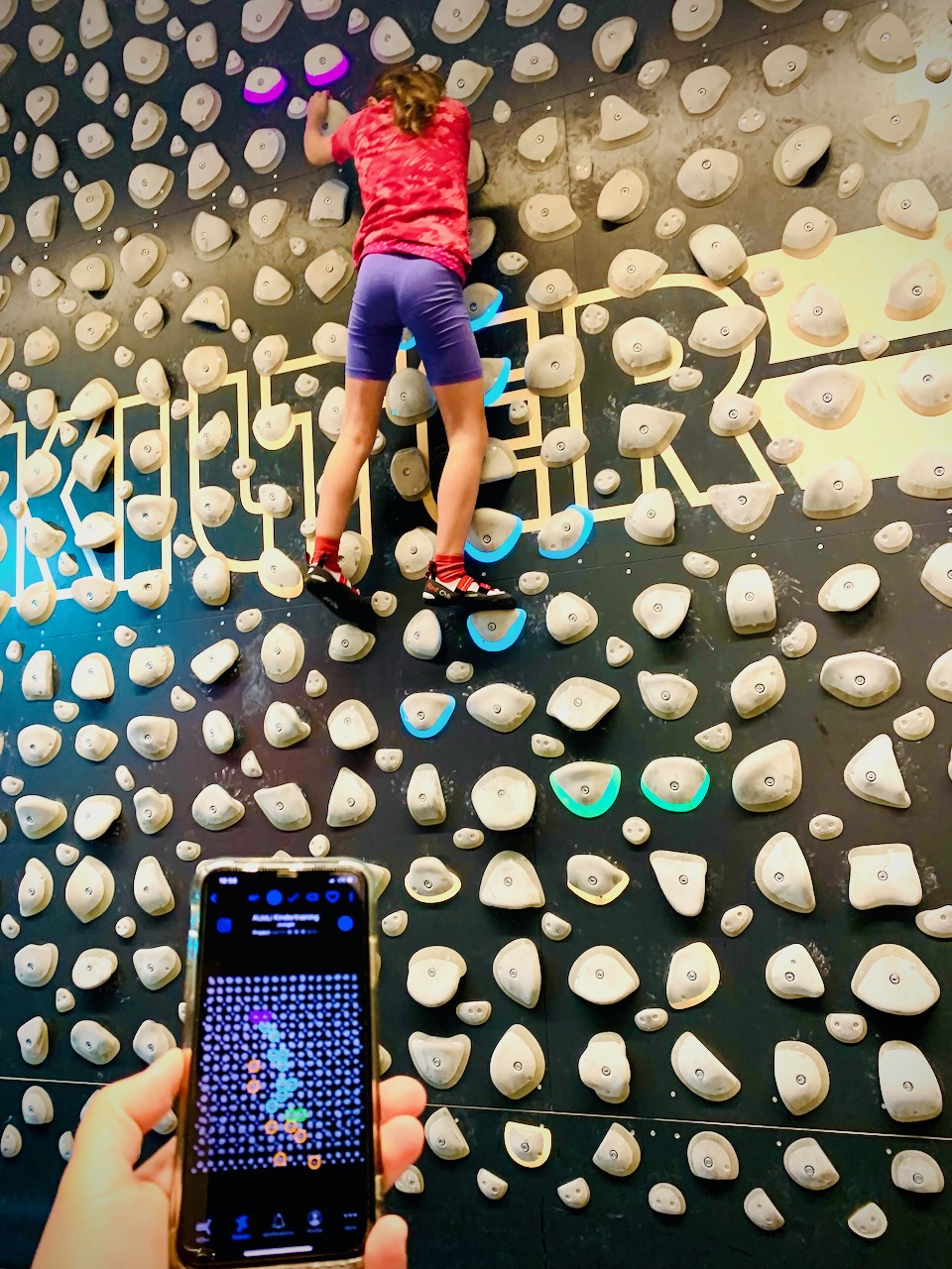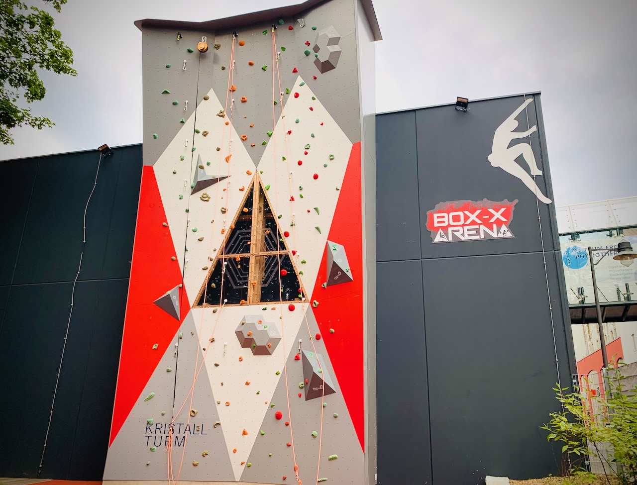 Das absolute Highlight der BOX-X Arena ist das Kilterboard, eine interaktive Kletterwand. Dafür ladet ihr euch die entsprechende App runter, sucht euch einen passenden Boulder, dieser wird auf das Board übertragen indem die Griffe entsprechend aufleuchten – und los geht’s. Insgesamt könnt ihr dabei auf über 50.000 vorhandene Boulder zugreifen oder selbst welche definieren. Wir haben beides ausprobiert. Es funktioniert großartig. Für die Kinder gibt es eine eigene Kategorie. Da tragen die Boulder dann Namen wie beispielsweise „Döner-Box“.